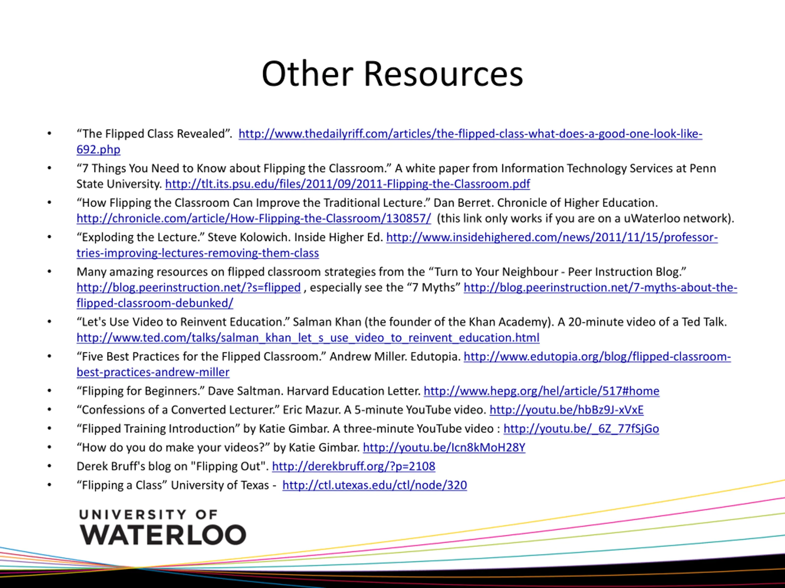 Other Resources The Flipped Class Revealed . http://www.thedailyriff.com/articles/the-flipped-class-what-does-a-good-one-look-like- 692.php 7 Things You Need to Know about Flipping the Classroom. A white paper from Information Technology Services at Penn State University. http://tlt.its.psu.edu/files/2011/09/2011-Flipping-the-Classroom.pdf How Flipping the Classroom Can Improve the Traditional Lecture. Dan Berret. Chronicle of Higher Education. http://chronicle.com/article/How-Flipping-the-Classroom/130857/ (this link only works if you are on a uWaterloo network). Exploding the Lecture. Steve Kolowich. Inside Higher Ed. http://www.insidehighered.com/news/2011/11/15/professor- tries-improving-lectures-removing-them-class Many amazing resources on flipped classroom strategies from the Turn to Your Neighbour - Peer Instruction Blog. http://blog.peerinstruction.net/?s=flipped , especially see the 7 Myths http://blog.peerinstruction.net/7-myths-about-the- flipped-classroom-debunked/ Let's Use Video to Reinvent Education. Salman Khan (the founder of the Khan Academy). A 20-minute video of a Ted Talk. http://www.ted.com/talks/salman_khan_let_s_use_video_to_reinvent_education.html Five Best Practices for the Flipped Classroom. Andrew Miller. Edutopia. http://www.edutopia.org/blog/flipped-classroom- best-practices-andrew-miller Flipping for Beginners. Dave Saltman. Harvard Education Letter. http://www.hepg.org/hel/article/517#home Confessions of a Converted Lecturer. Eric Mazur. A 5-minute YouTube video. http://youtu.be/hbBz9J-xVxE Flipped Training Introduction by Katie Gimbar. A three-minute YouTube video : http://youtu.be/_6Z_77fSjGo How do you do make your videos? by Katie Gimbar. http://youtu.be/Icn8kMoH28Y Derek Bruff's blog on "Flipping Out". http://derekbruff.org/?p=2108 Flipping a Class University of Texas - http://ctl.utexas.edu/ctl/node/320