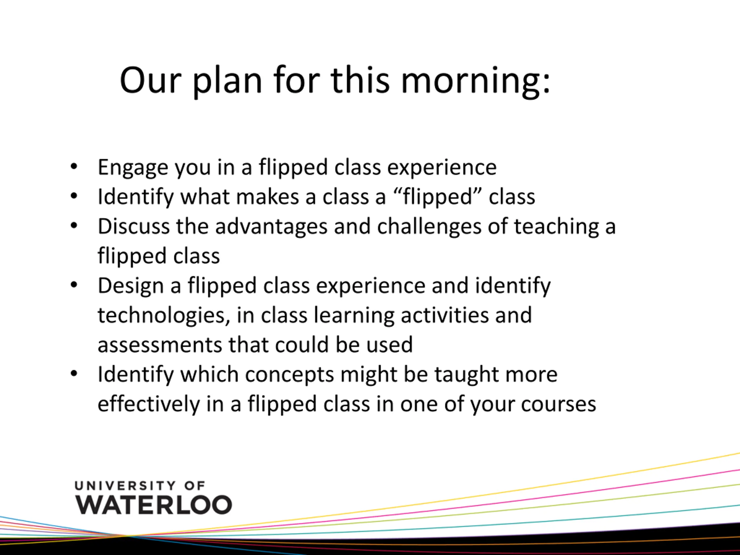 Our plan for this morning: Engage you in a flipped class experience Identify what makes a class a flipped class Discuss the advantages and challenges of teaching a flipped class Design a flipped class experience and identify technologies, in class learning activities and assessments that could be used Identify which concepts might be taught more effectively in a flipped class in one of your courses