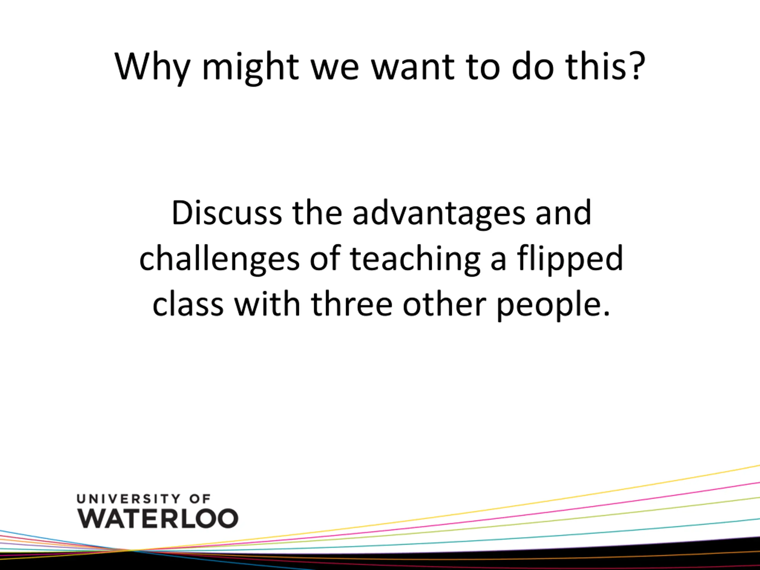 Why might we want to do this? Discuss the advantages and challenges of teaching a flipped class with three other people.