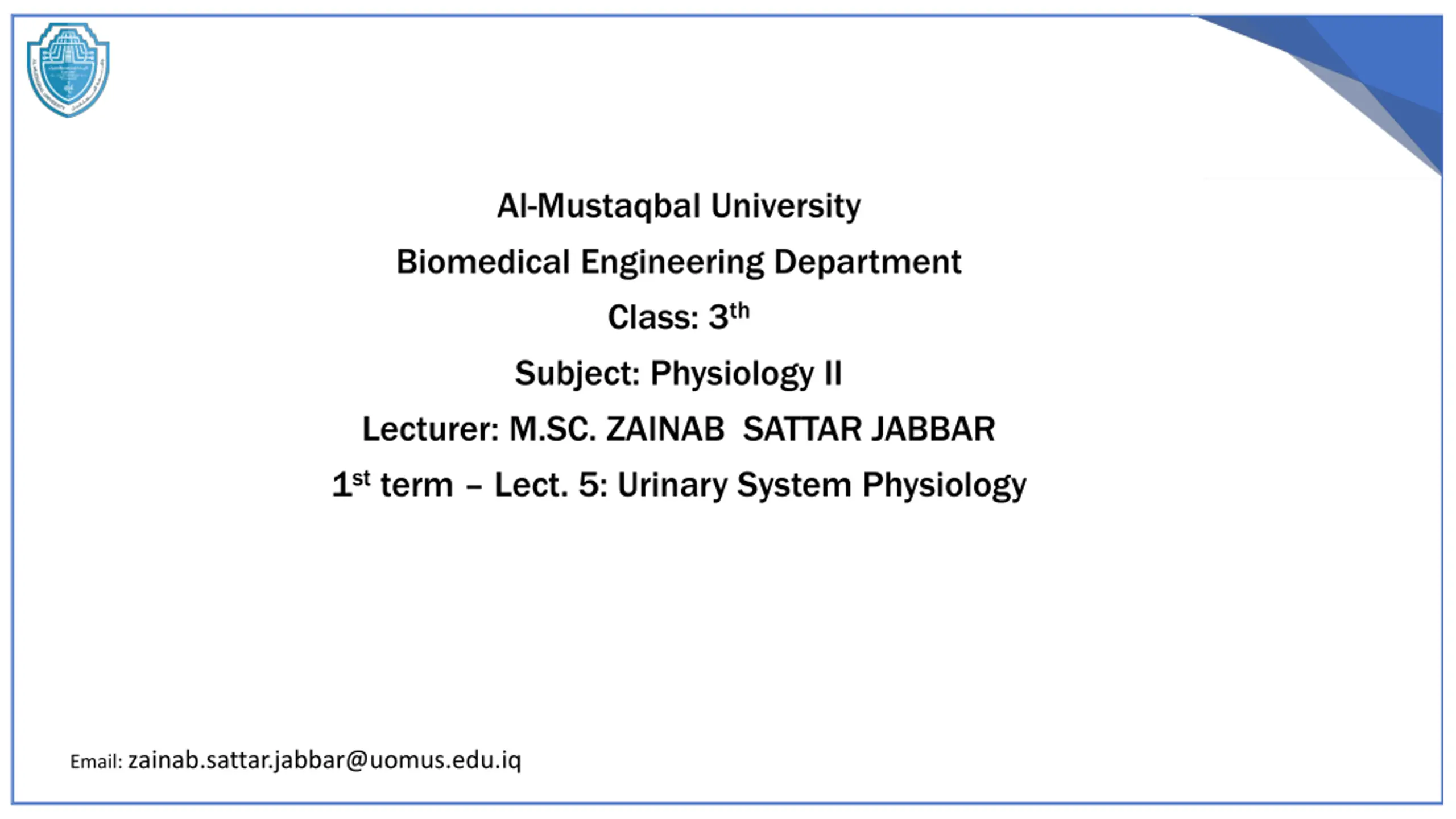 Al-Mustaqbal University Biomedical Engineering Department Class: 3th Subject: Physiology II Lecturer: M.SC. ZAINAB SATTAR JABBAR 1st term Lect. 5: Urinary System Physiology Email: zainab.sattar.jabbar@uomus.edu.iq