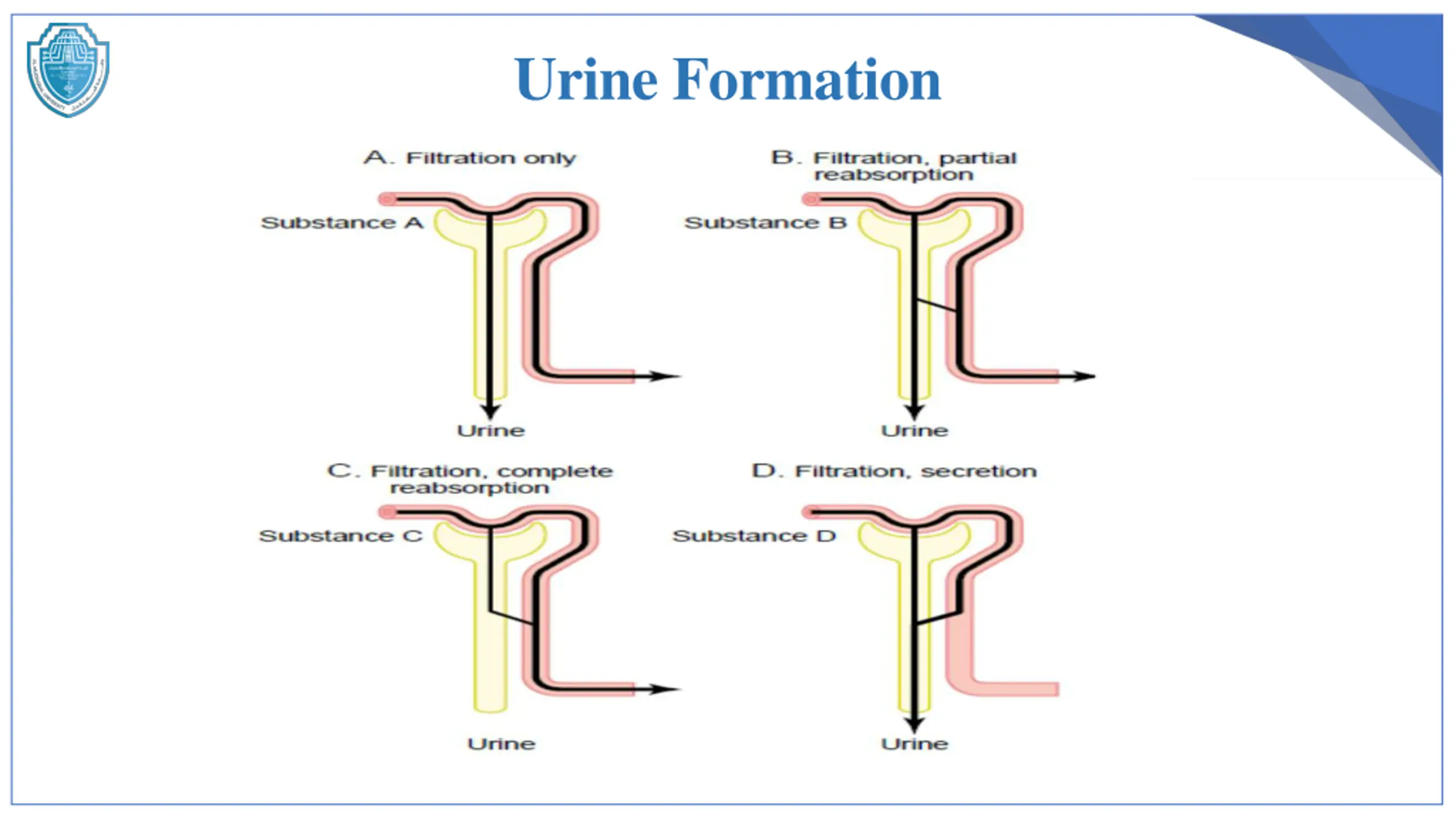 Urine Formation If the substance shown in panel A is freely filtered by the glomerular capillaries but is neither reabsorbed nor secreted, therefore, its excretion rate is equal to the rate at which it was filtered, such as creatinine. In panel B, the substance is freely filtered but is also partly reabsorbed from the tubules back into the blood. Therefore, the excretion rate is calculated as the filtration rate minus the reabsorption rate. This is typical for many of the electrolytes of the body. In panel C, the substance is freely filtered at the glomerular capillaries but is not excreted into the urine because all the filtered substance is reabsorbed from the tubules back into the blood. Therefore, its excretion rate is equal to zero, such as amino acids and glucose. The substance in panel D is freely filtered at the glomerular capillaries and is not reabsorbed, but additional quantities of this substance are secreted from the peritubular capillary blood into the renal tubules. The excretion rate in this case is calculated as filtration rate plus tubular secretion rate which occurs for organic acids and bases.