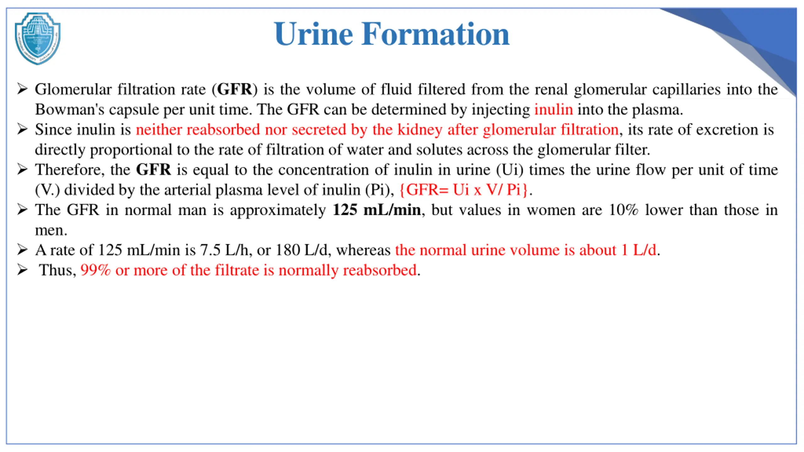 Urine Formation Glomerular filtration rate (GFR) is the volume of fluid filtered from the renal glomerular capillaries into the Bowman's capsule per unit time. The GFR can be determined by injecting inulin into the plasma. Since inulin is neither reabsorbed nor secreted by the kidney after glomerular filtration, its rate of excretion is directly proportional to the rate of filtration of water and solutes across the glomerular filter. Therefore, the GFR is equal to the concentration of inulin in urine (Ui) times the urine flow per unit of time (V.) divided by the arterial plasma level of inulin (Pi), {GFR= Ui x V/ Pi}. The GFR in normal man is approximately 125 mL/min, but values in women are 10% lower than those in men. A rate of 125 mL/min is 7.5 L/h, or 180 L/d, whereas the normal urine volume is about 1 L/d. Thus, 99% or more of the filtrate is normally reabsorbed.