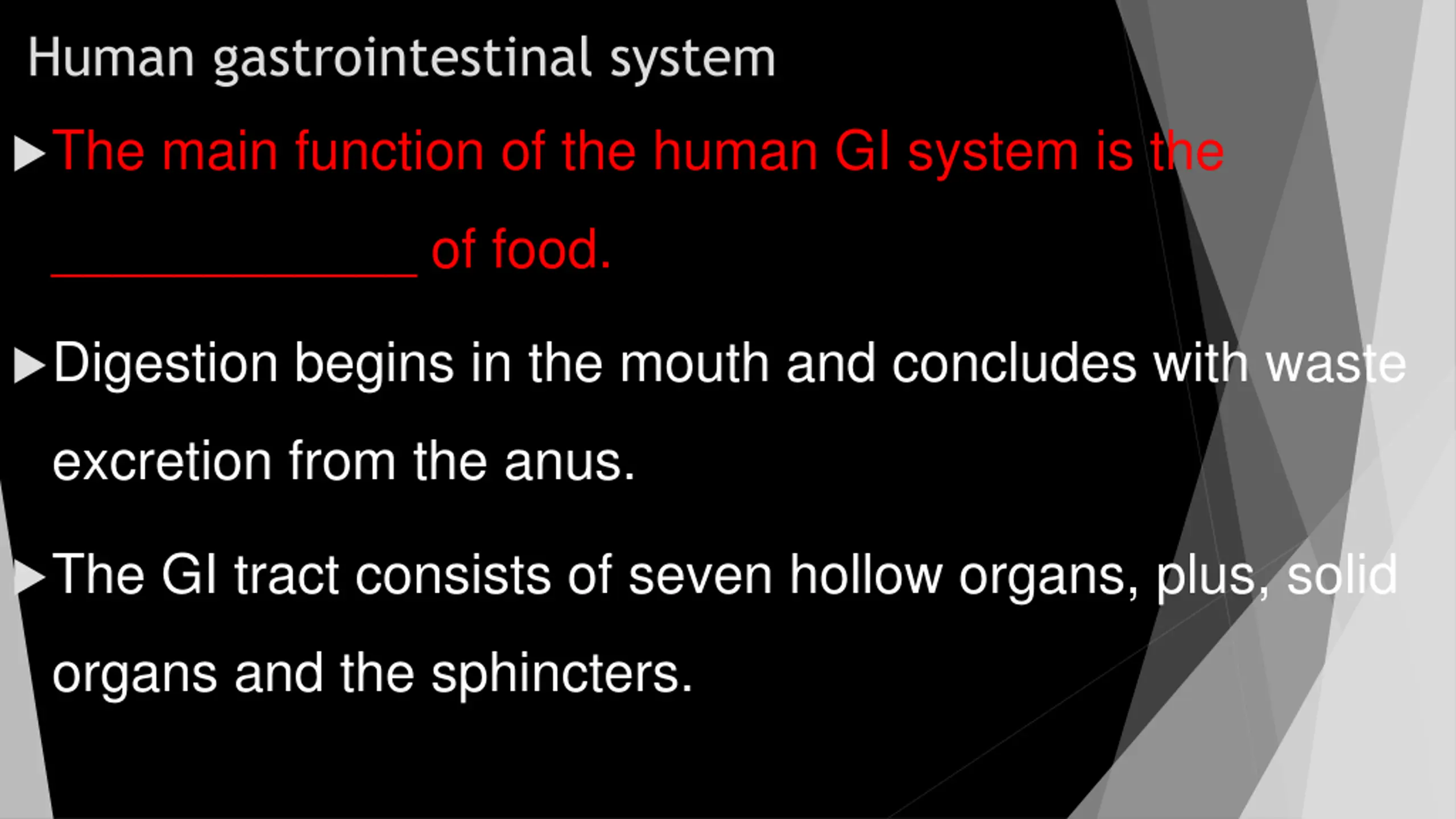 Human gastrointestinal system The main function of the human GI system is the ____________ of food. Digestion begins in the mouth and concludes with waste excretion from the anus. The GI tract consists of seven hollow organs, plus, solid organs and the sphincters.
