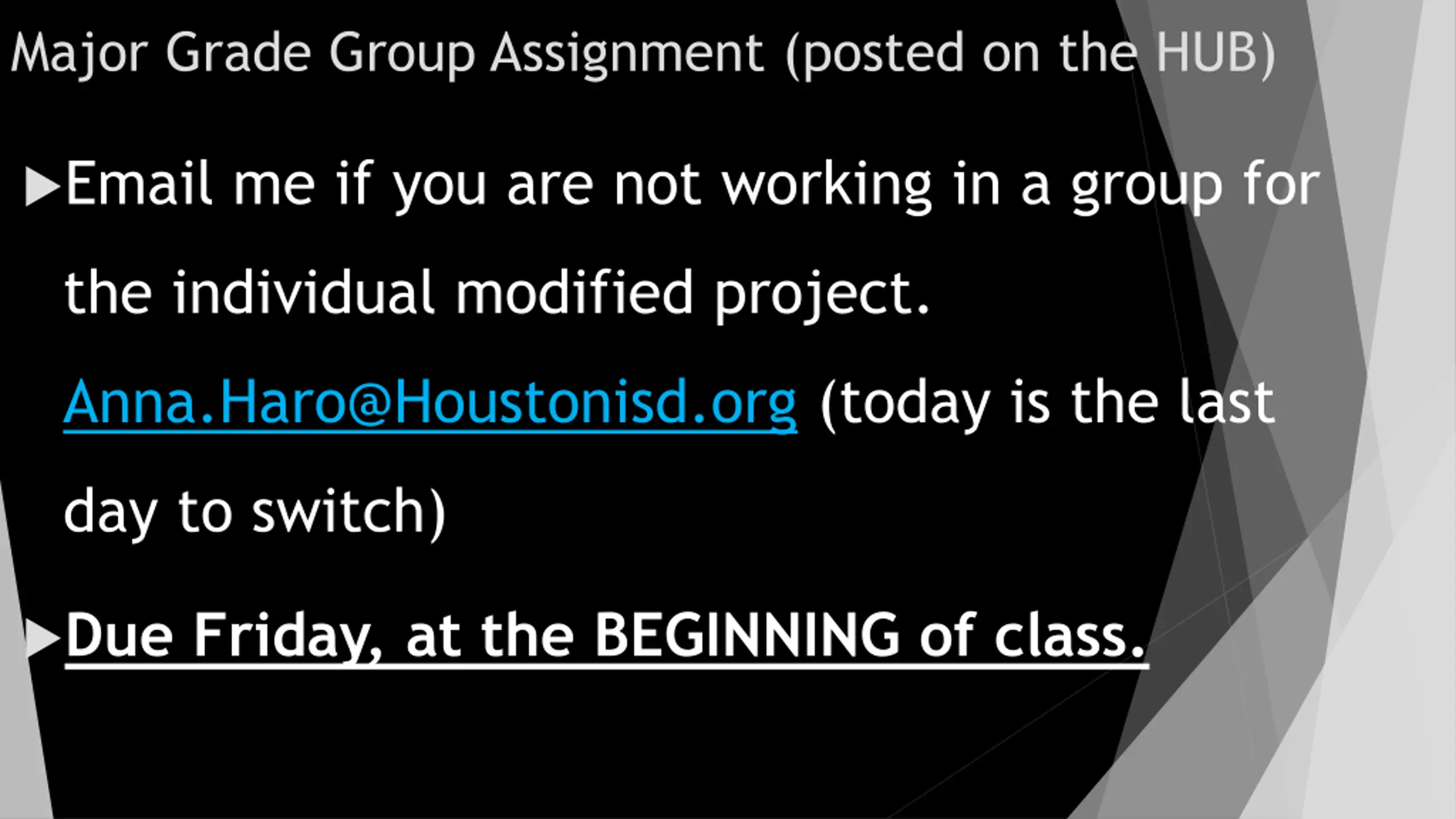 Major Grade Group Assignment (posted on the HUB) Email me if you are not working in a group for the individual modified project. Anna.Haro@Houstonisd.org (today is the last day to switch) Due Friday, at the BEGINNING of class.