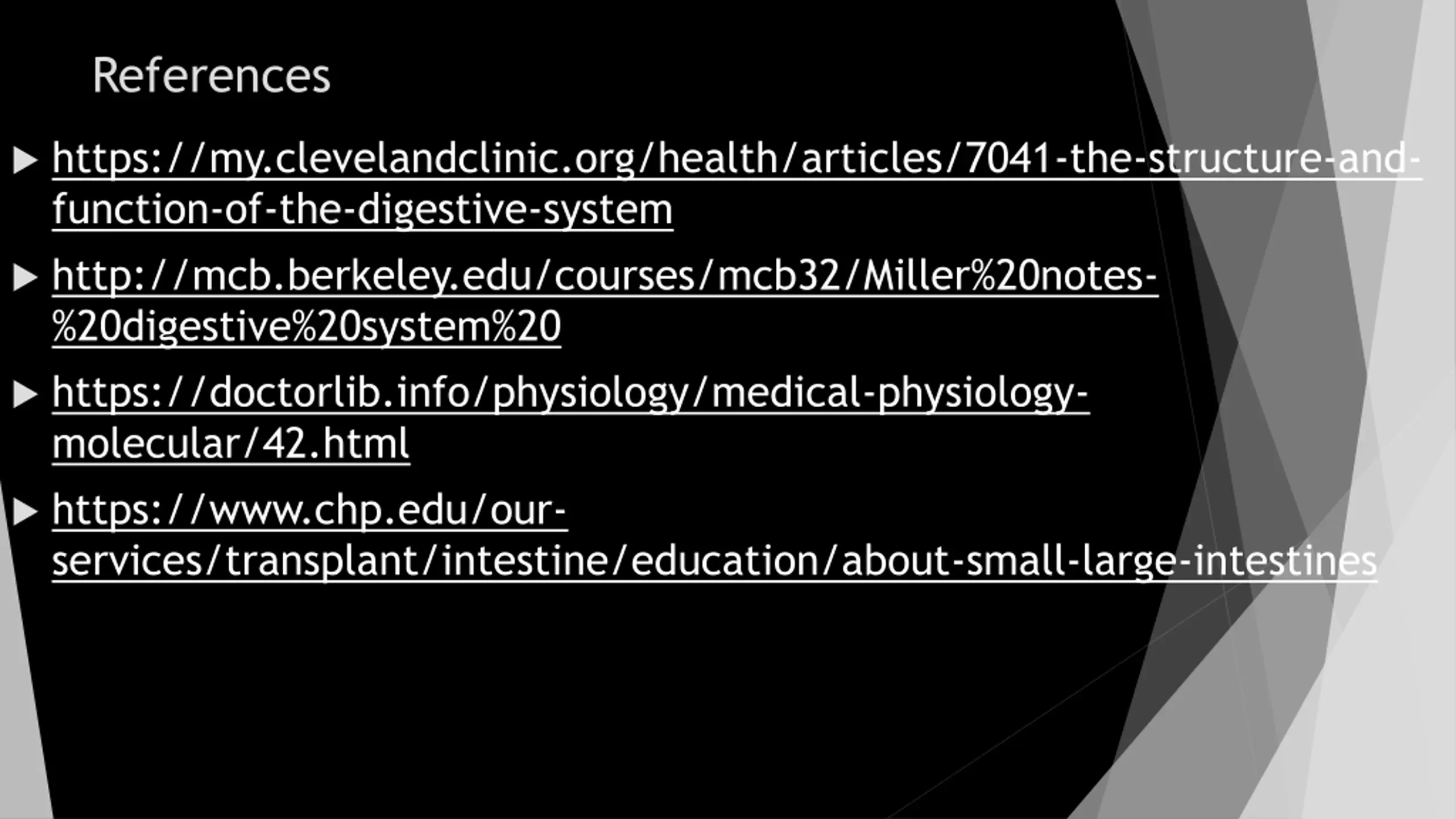 References https://my.clevelandclinic.org/health/articles/7041-the-structure-and- function-of-the-digestive-system http://mcb.berkeley.edu/courses/mcb32/Miller%20notes- %20digestive%20system%20 https://doctorlib.info/physiology/medical-physiology- molecular/42.html https://www.chp.edu/our- services/transplant/intestine/education/about-small-large-intestines