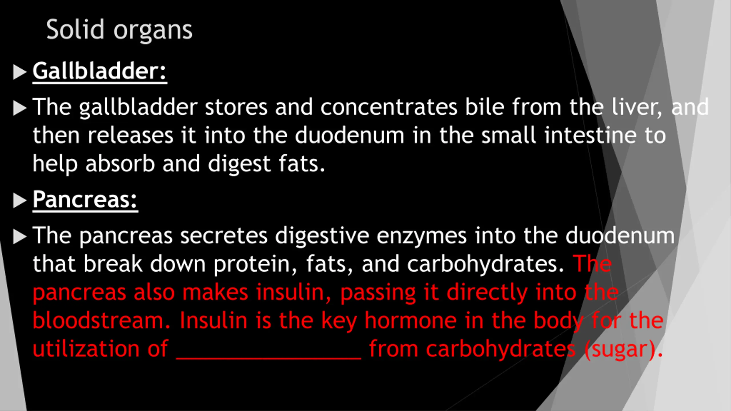 Solid organs Gallbladder: The gallbladder stores and concentrates bile from the liver, and then releases it into the duodenum in the small intestine to help absorb and digest fats. Pancreas: The pancreas secretes digestive enzymes into the duodenum that break down protein, fats, and carbohydrates. The pancreas also makes insulin, passing it directly into the bloodstream. Insulin is the key hormone in the body for the utilization of _______________ from carbohydrates (sugar).