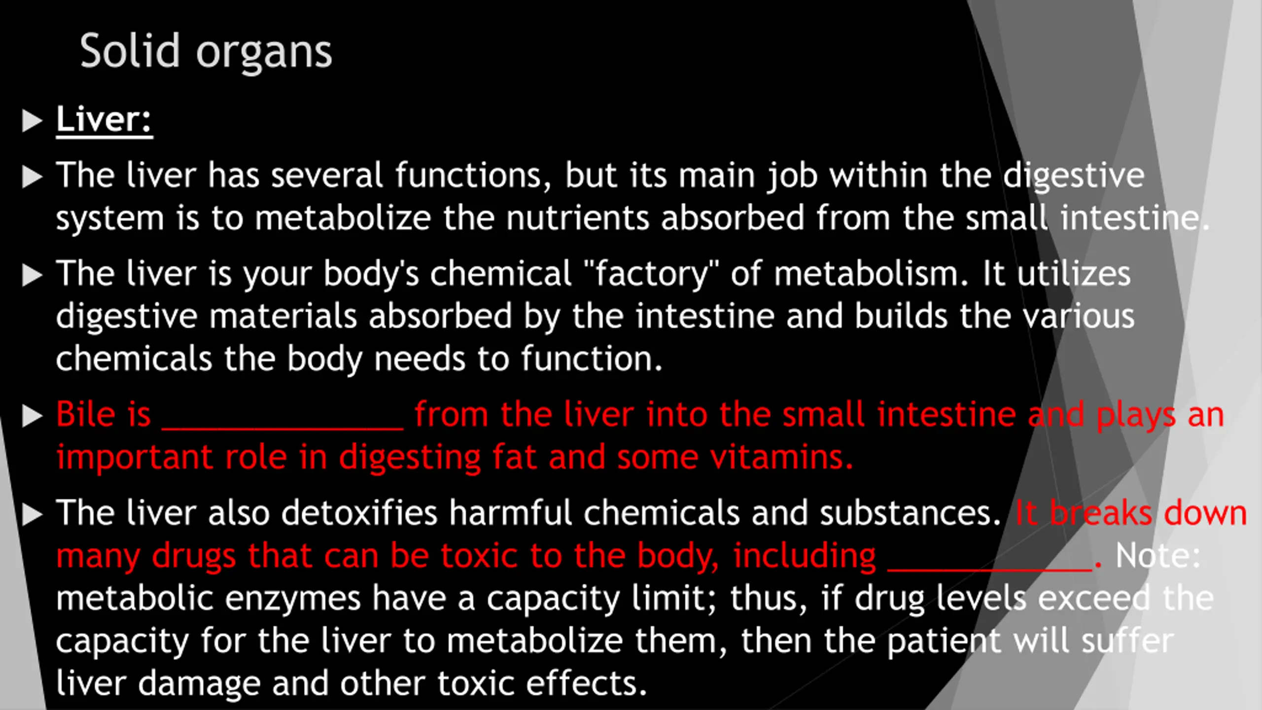 Solid organs Liver: The liver has several functions, but its main job within the digestive system is to metabolize the nutrients absorbed from the small intestine. The liver is your body's chemical "factory" of metabolism. It utilizes digestive materials absorbed by the intestine and builds the various chemicals the body needs to function. Bile is _____________ from the liver into the small intestine and plays an important role in digesting fat and some vitamins. The liver also detoxifies harmful chemicals and substances. It breaks down many drugs that can be toxic to the body, including ___________. Note: metabolic enzymes have a capacity limit; thus, if drug levels exceed the capacity for the liver to metabolize them, then the patient will suffer liver damage and other toxic effects.