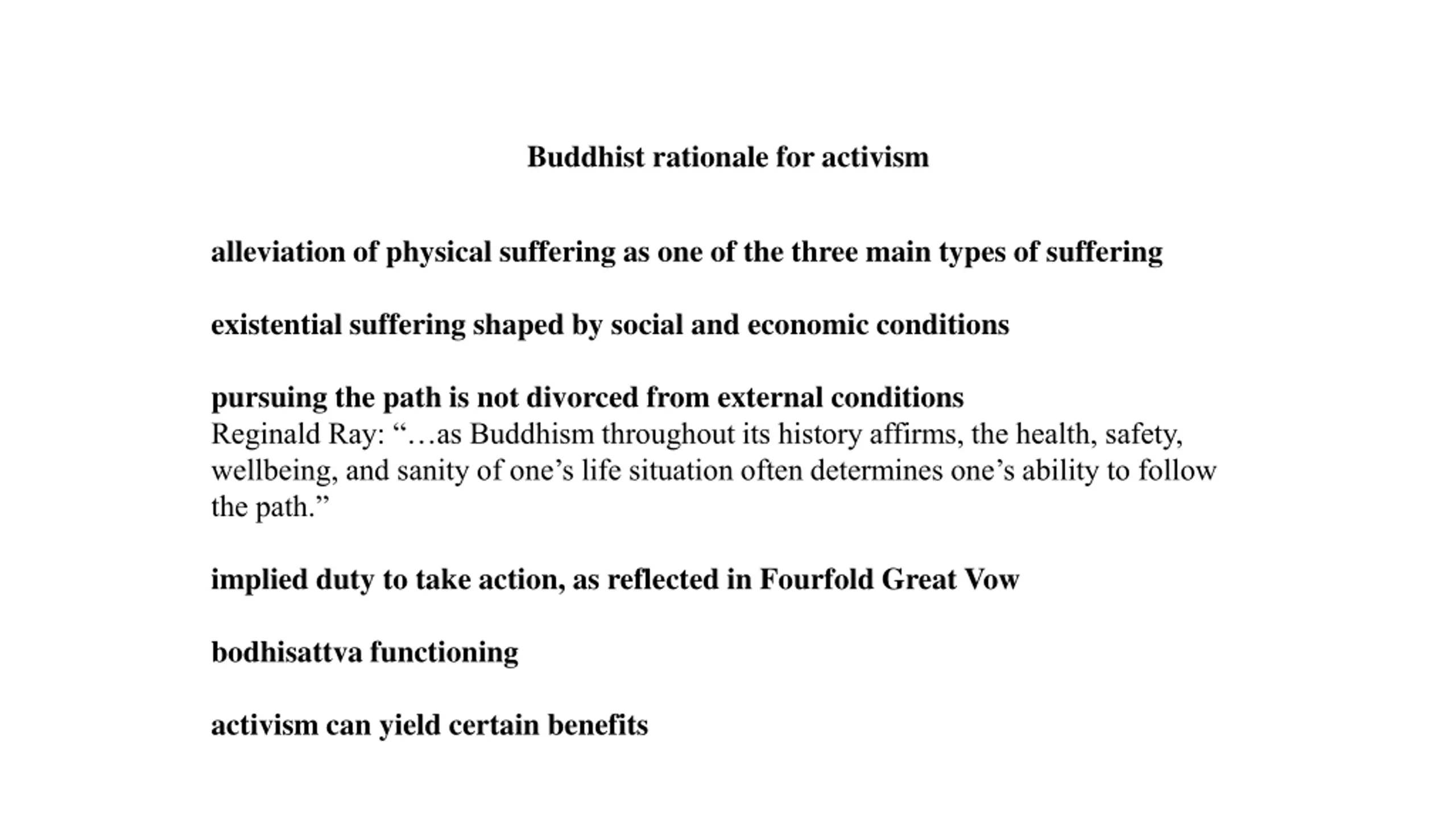 Buddhist rationale for activism alleviation of physical suffering as one of the three main types of suffering existential suffering shaped by social and economic conditions pursuing the path is not divorced from external conditions Reginald Ray: as Buddhism throughout its history affirms, the health, safety, wellbeing, and sanity of one s life situation often determines one s ability to follow the path. implied duty to take action, as reflected in Fourfold Great Vow bodhisattva functioning activism can yield certain benefits