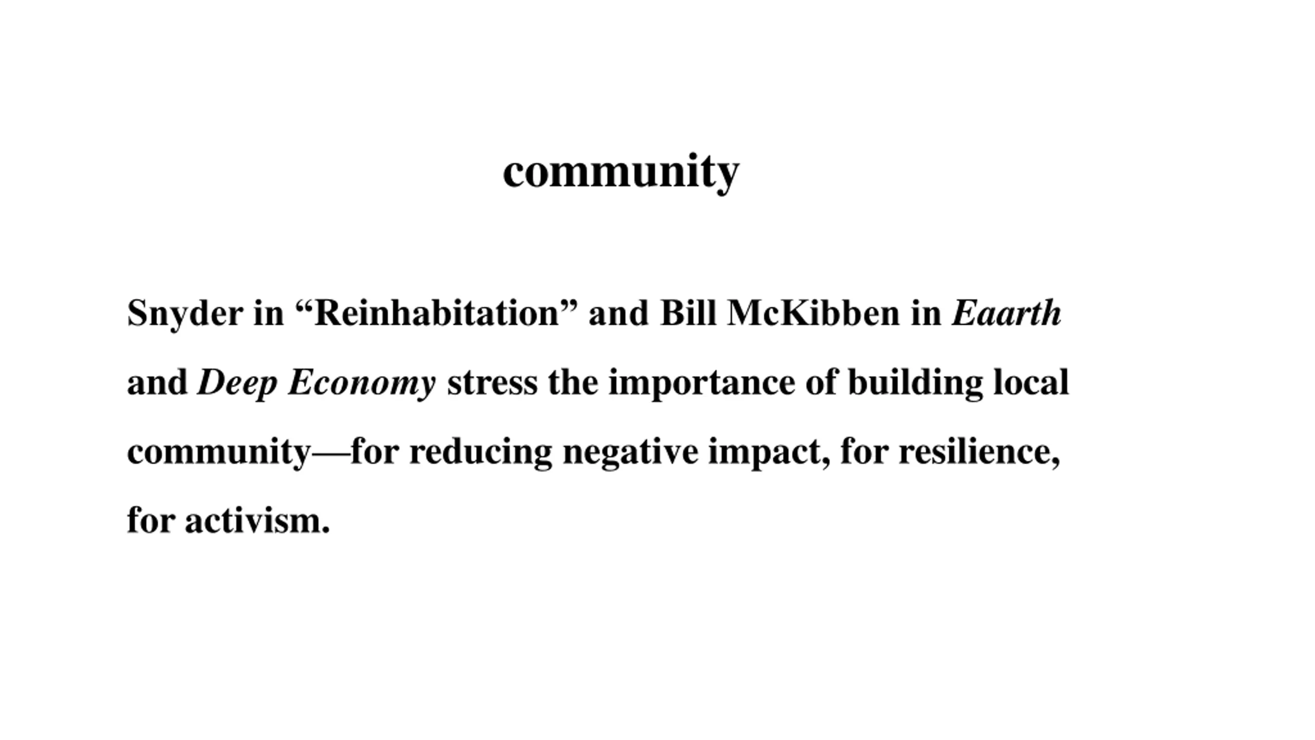community Snyder in Reinhabitation and Bill McKibben in Eaarth and Deep Economy stress the importance of building local community for reducing negative impact, for resilience, for activism.