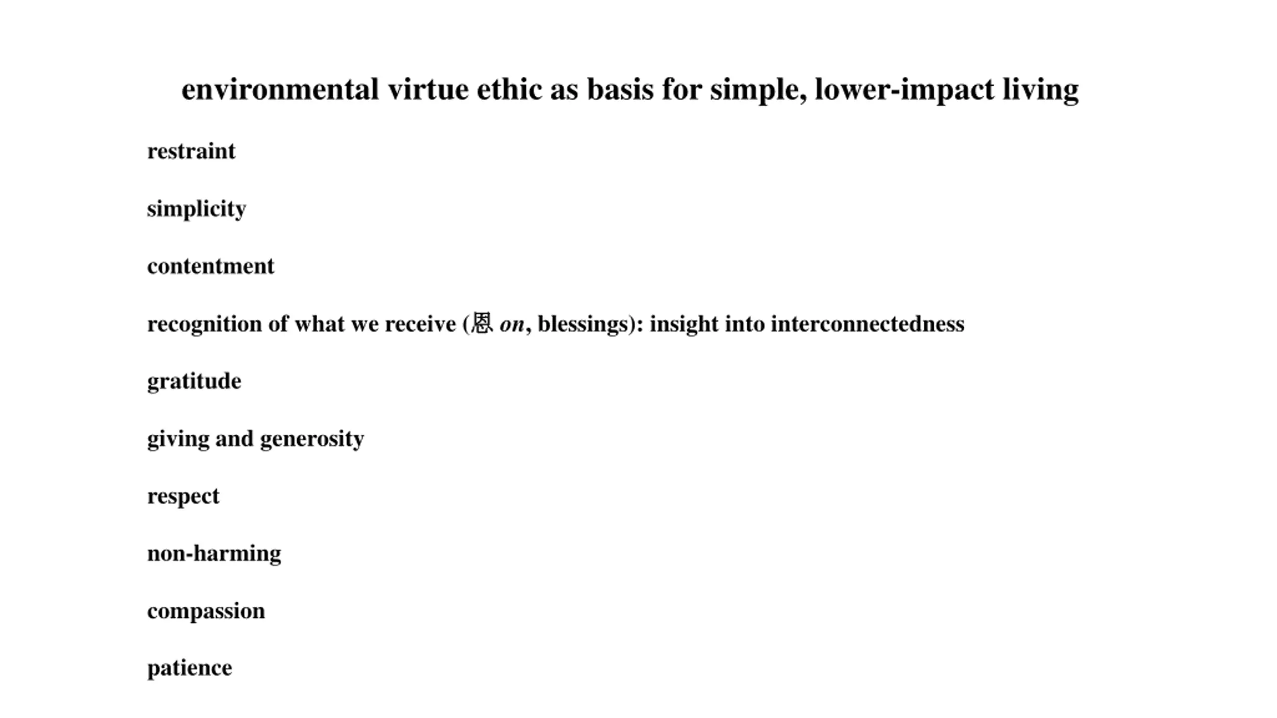 environmental virtue ethic as basis for simple, lower-impact living restraint simplicity contentment recognition of what we receive ( on, blessings): insight into interconnectedness gratitude giving and generosity respect non-harming compassion patience