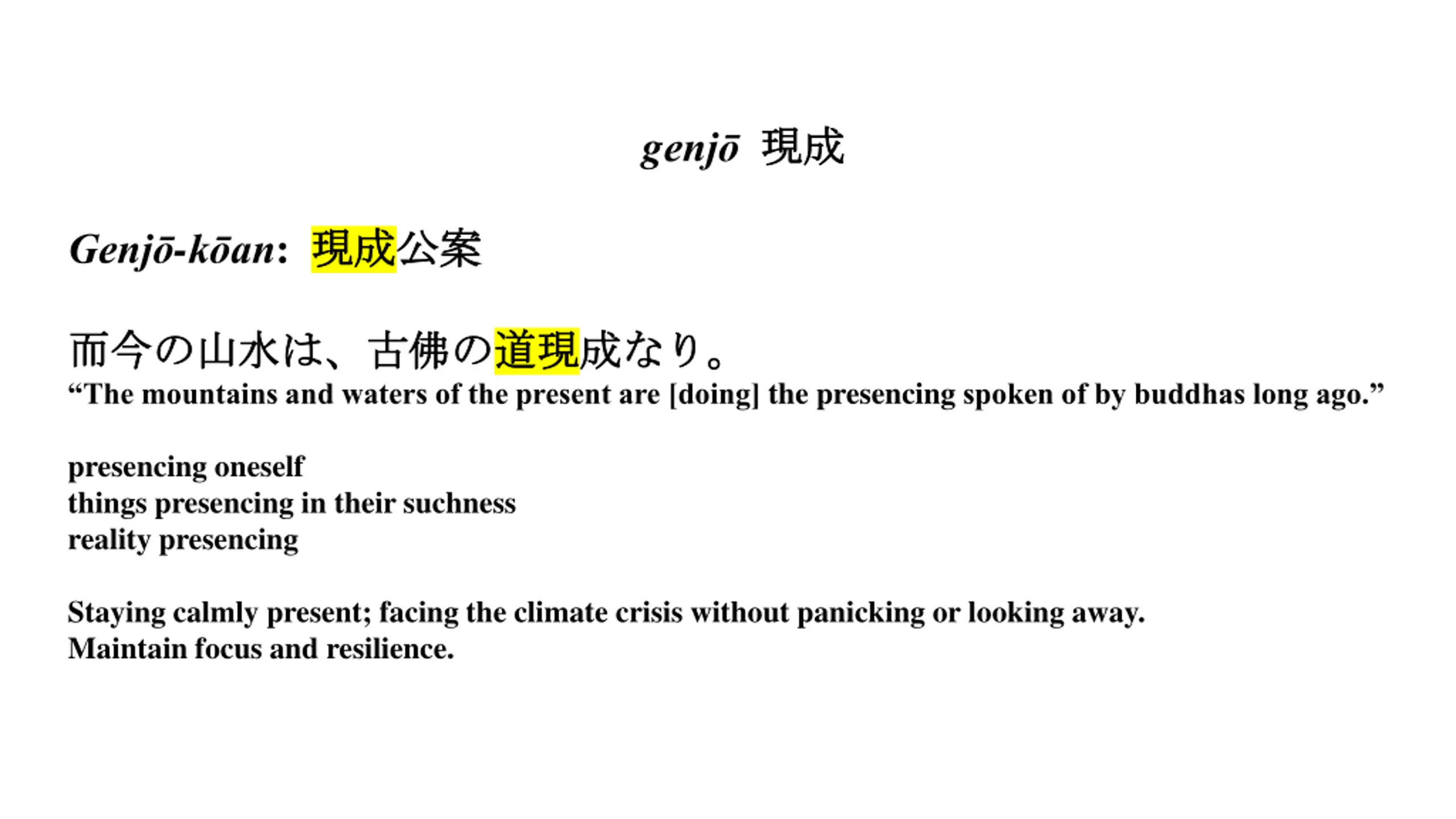 genj Genj -k an: The mountains and waters of the present are [doing]the presencing spoken of by buddhas long ago. presencing oneself things presencing in their suchness reality presencing Staying calmly present; facing the climate crisis without panicking or looking away. Maintain focus and resilience.