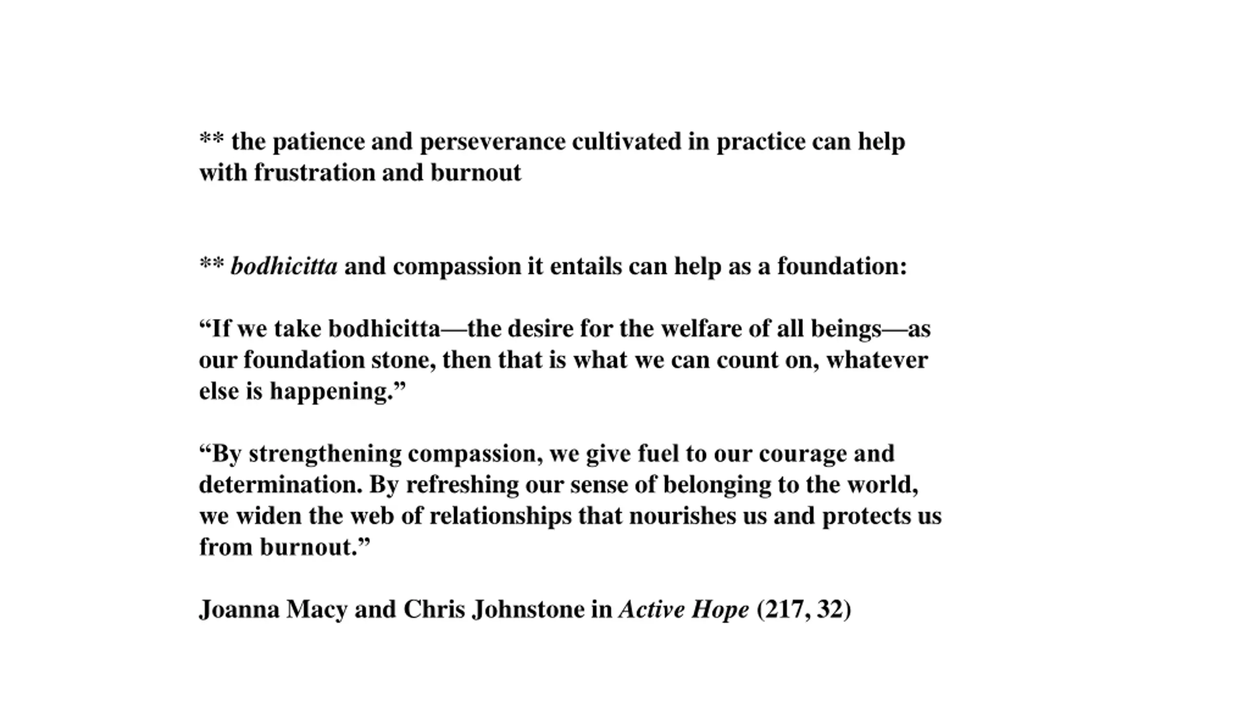 ** the patience and perseverance cultivated in practice can help with frustration and burnout ** bodhicitta and compassion it entails can help as a foundation: If we take bodhicitta the desire for the welfare of all beings as our foundation stone, then that is what we can count on, whatever else is happening. By strengthening compassion, we give fuel to our courage and determination. By refreshing our sense of belonging to the world, we widen the web of relationships that nourishes us and protects us from burnout. Joanna Macy and Chris Johnstone in Active Hope (217, 32)