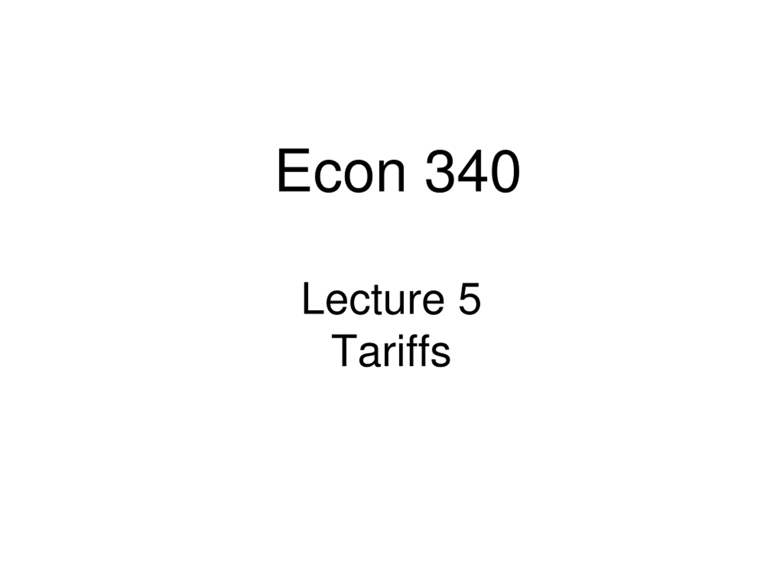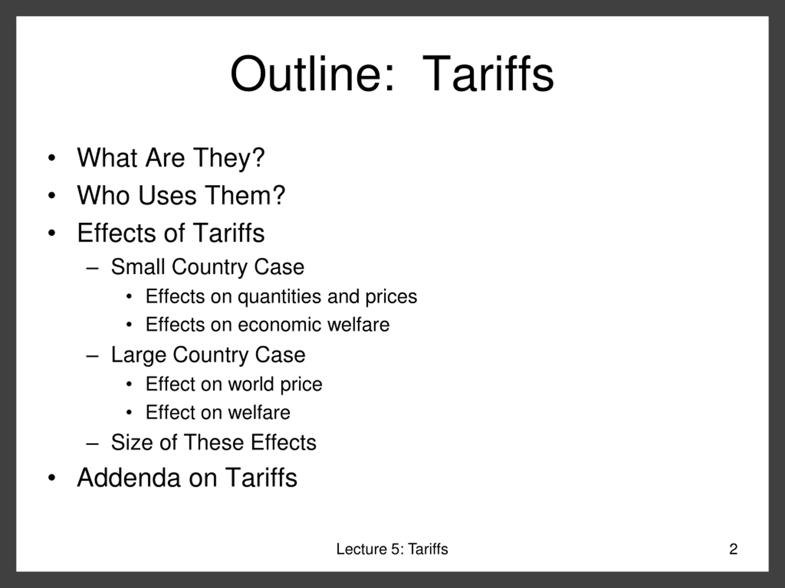Outline: Tariffs What Are They? Who Uses Them? Effects of Tariffs Small Country Case Effects on quantities and prices Effects on economic welfare Large Country Case Effect on world price Effect on welfare Size of These Effects Addenda on Tariffs Lecture 5: Tariffs 2