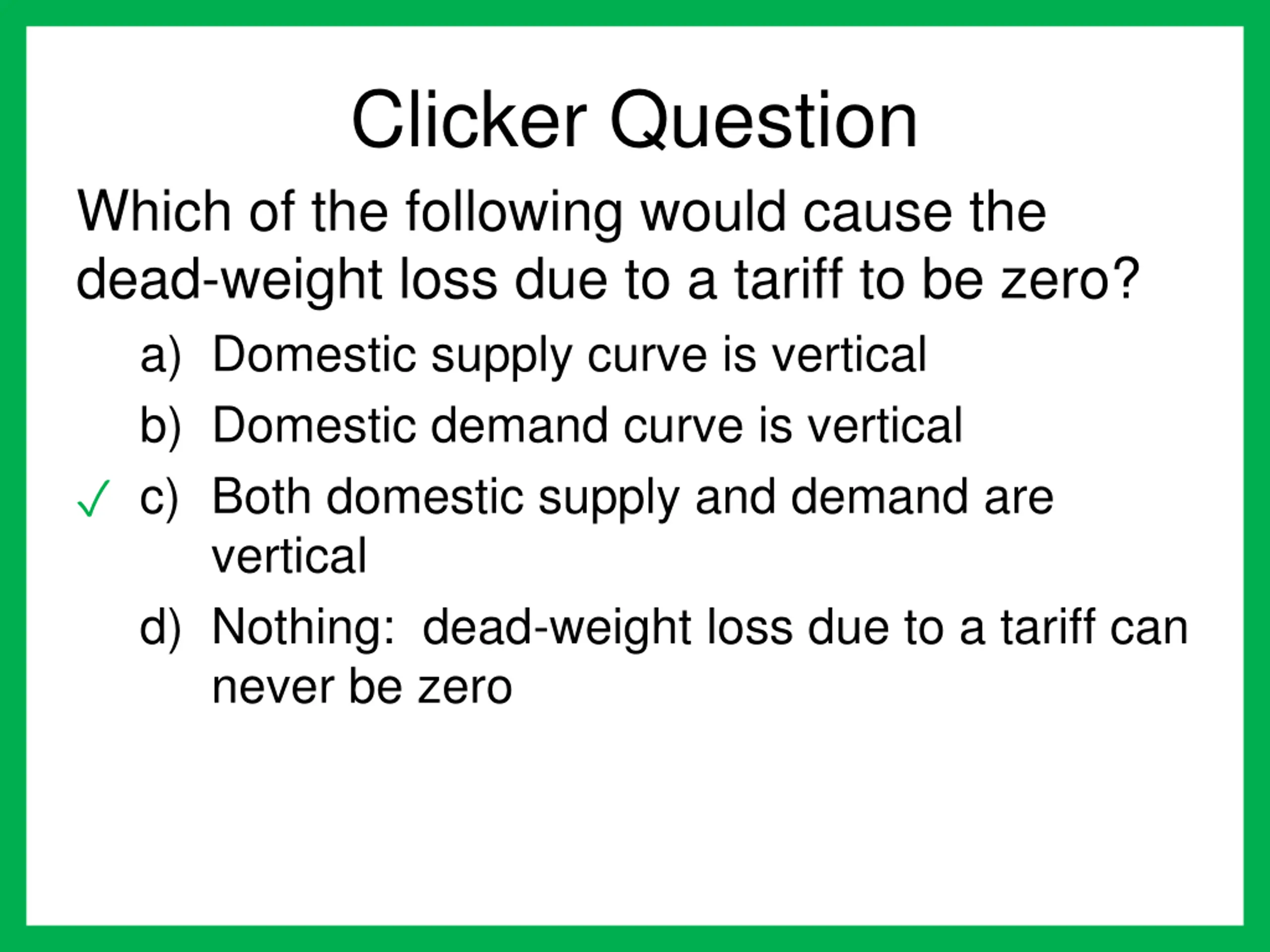 Clicker Question Which of the following would cause the dead-weight loss due to a tariff to be zero? a) Domestic supply curve is vertical b) Domestic demand curve is vertical c) Both domestic supply and demand are vertical d) Nothing: dead-weight loss due to a tariff can never be zero