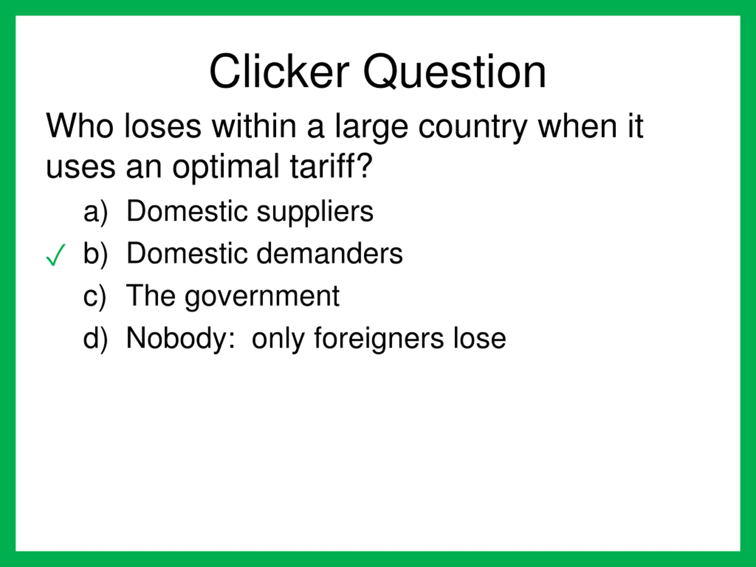 Clicker Question Who loses within a large country when it uses an optimal tariff? a) Domestic suppliers b) Domestic demanders c) The government d) Nobody: only foreigners lose