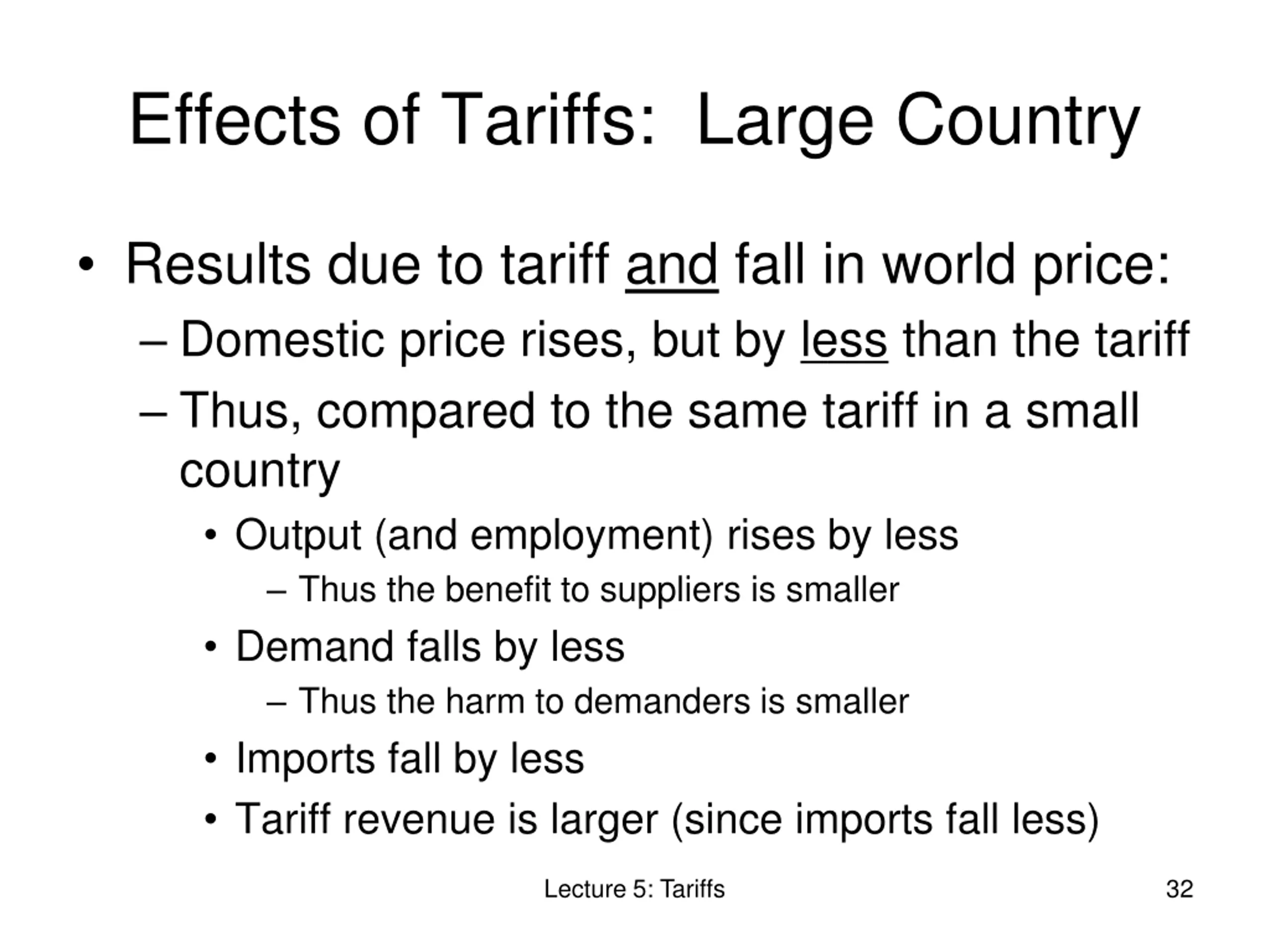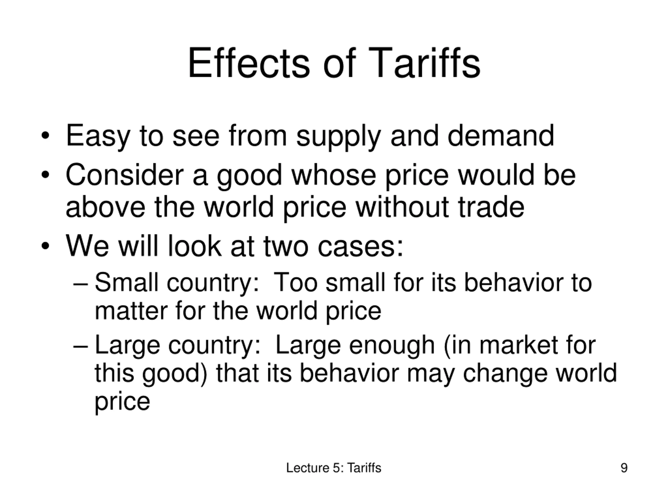 Outline: Tariffs What Are They? Who Uses Them? Effects of Tariffs Small Country Case Effects on quantities and prices Effects on economic welfare Large Country Case Effect on world price Effect on welfare Size of These Effects Addenda on Tariffs Lecture 5: Tariffs 8