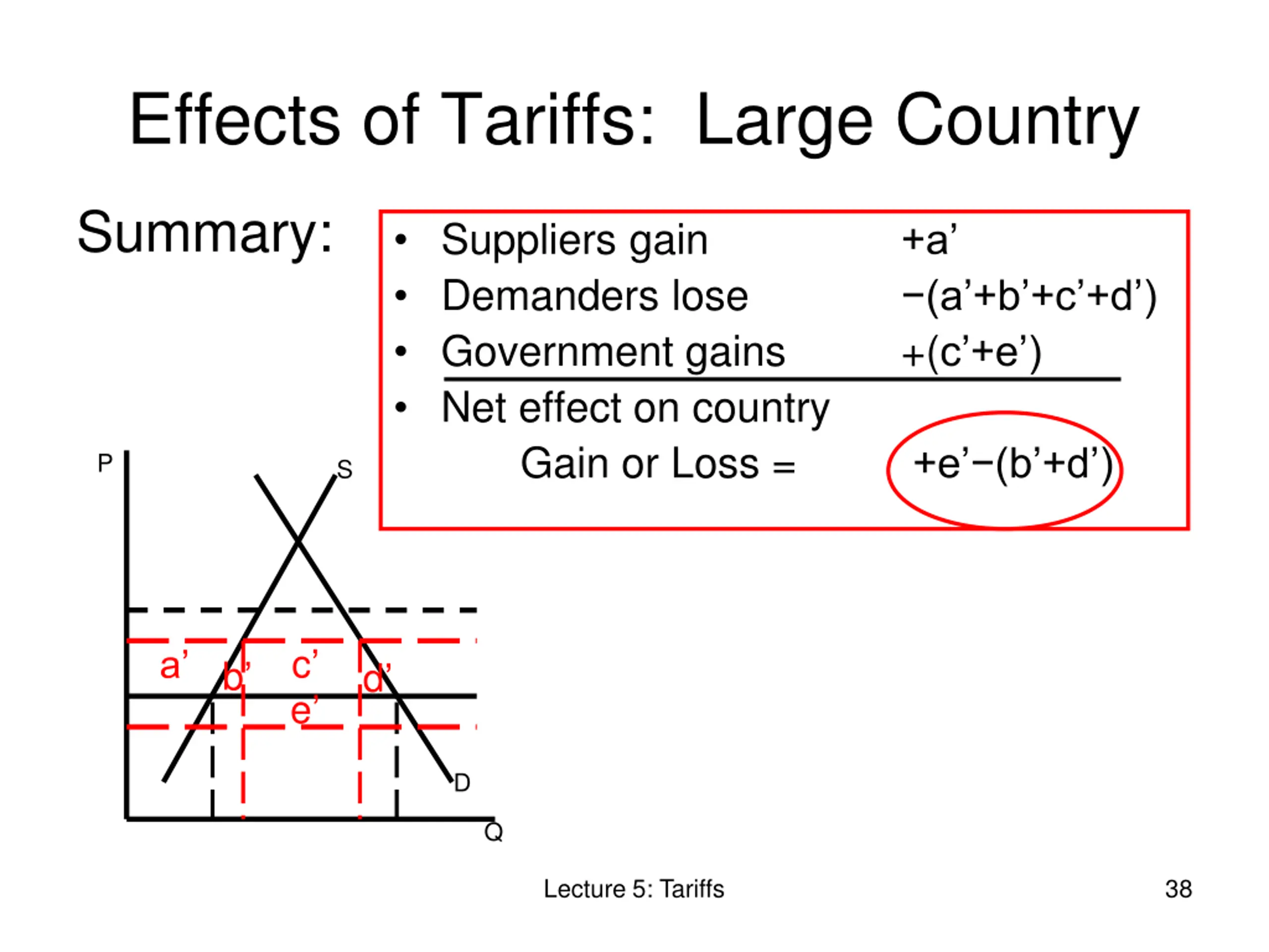 Effects of Tariffs: Large Country Summary: Suppliers gain Demanders lose Government gains Net effect on country Gain or Loss = +a (a +b +c +d ) +(c +e ) +e (b +d ) P S c e a b d D Q Lecture 5: Tariffs 38