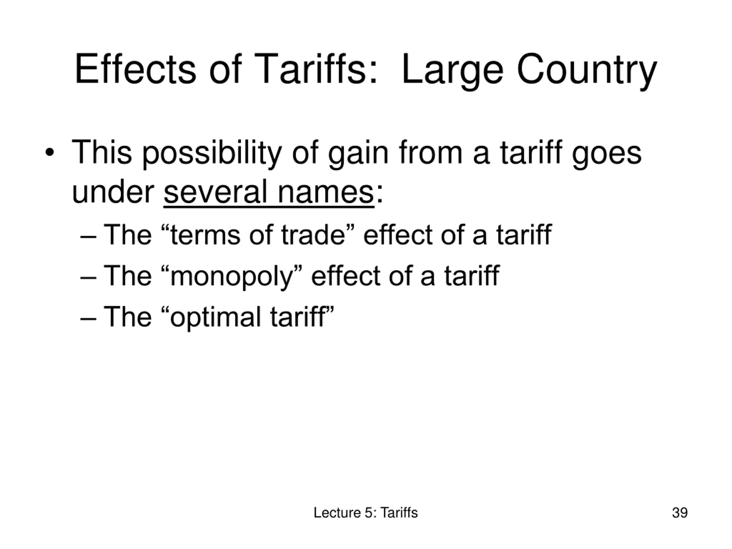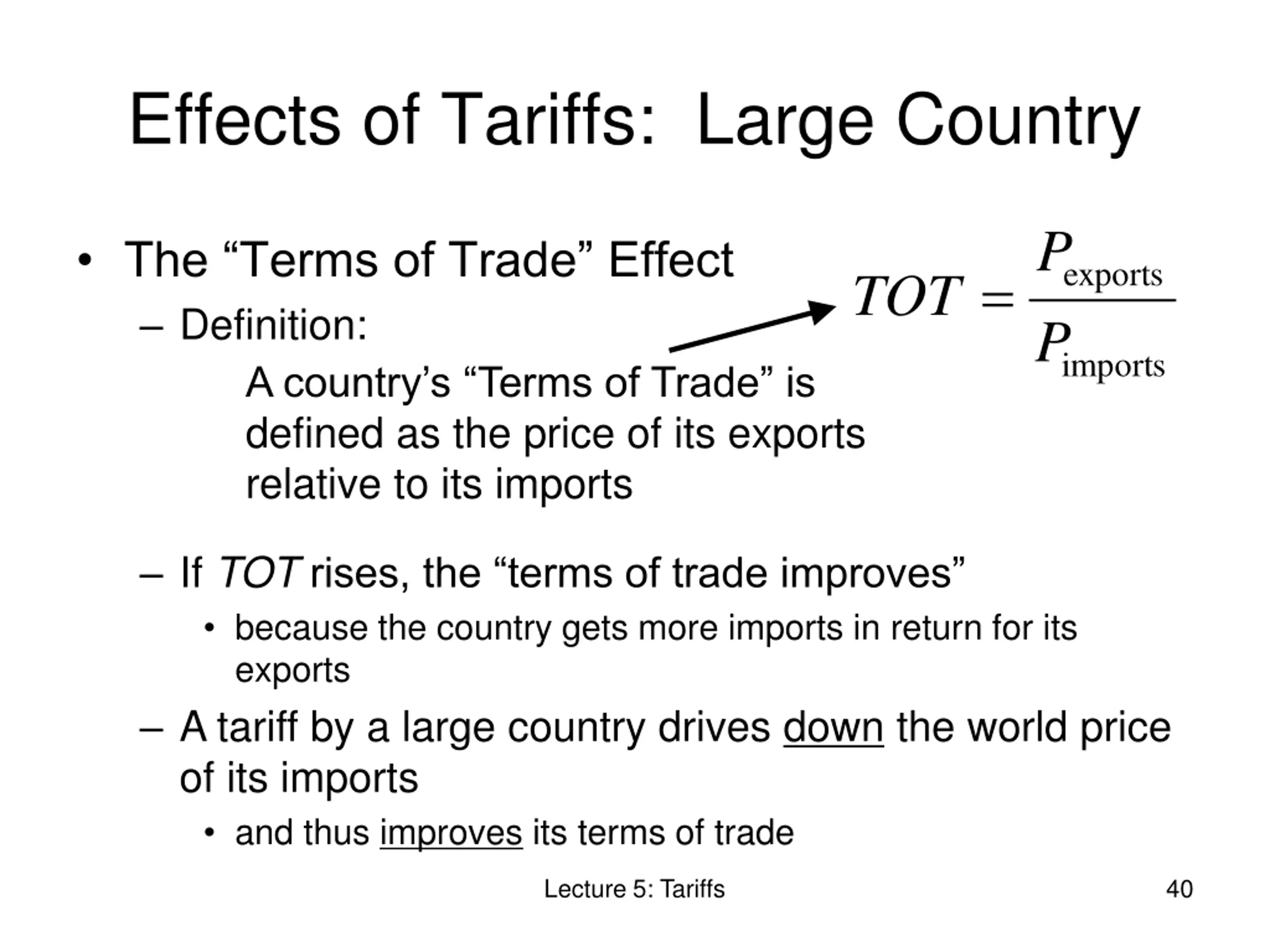 Effects of Tariffs: Large Country This possibility of gain from a tariff goes under several names: The terms of trade effect of a tariff The monopoly effect of a tariff The optimal tariff Lecture 5: Tariffs 39
