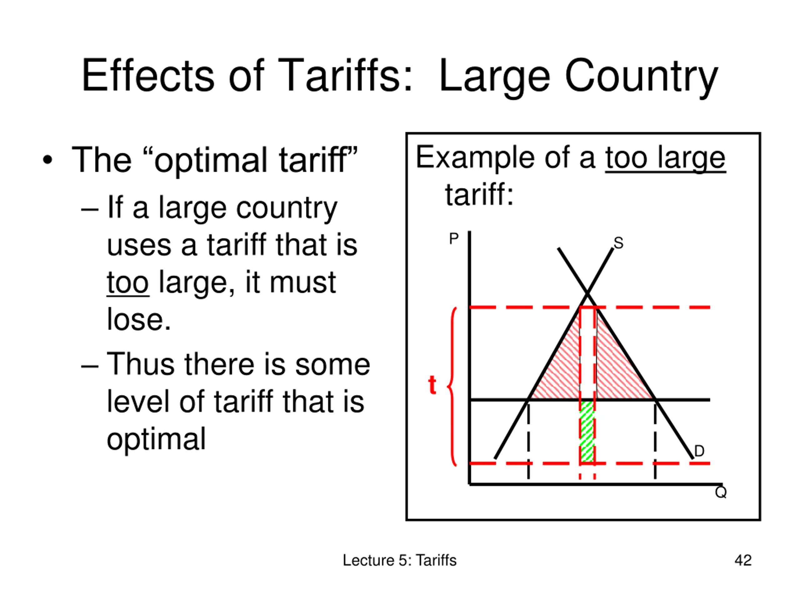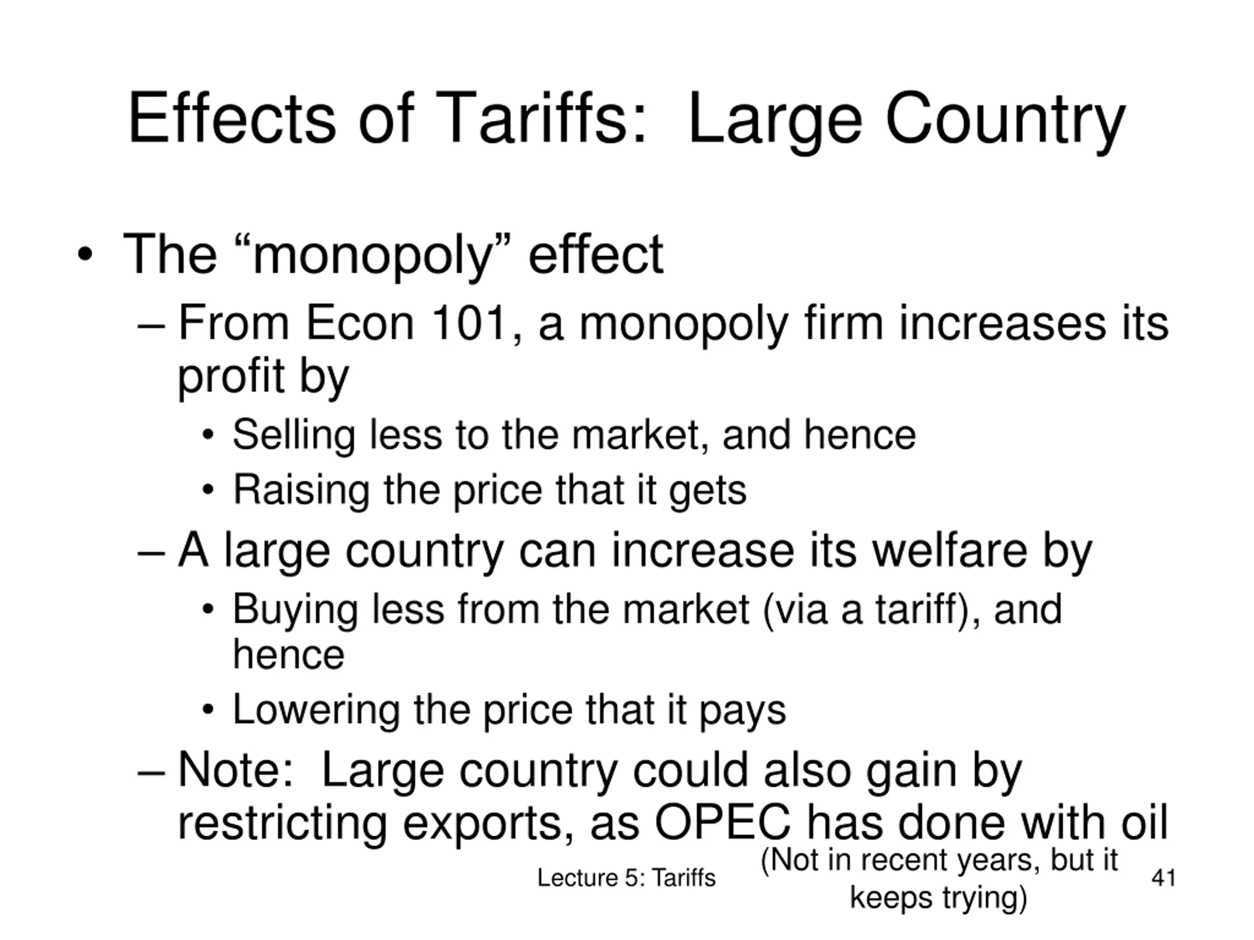 Effects of Tariffs: Large Country The monopoly effect From Econ 101, a monopoly firm increases its profit by Selling less to the market, and hence Raising the price that it gets A large country can increase its welfare by Buying less from the market (via a tariff), and hence Lowering the price that it pays Note: Large country could also gain by restricting exports, as OPEC has done with oil (Not in recent years, but it keeps trying) Lecture 5: Tariffs 41