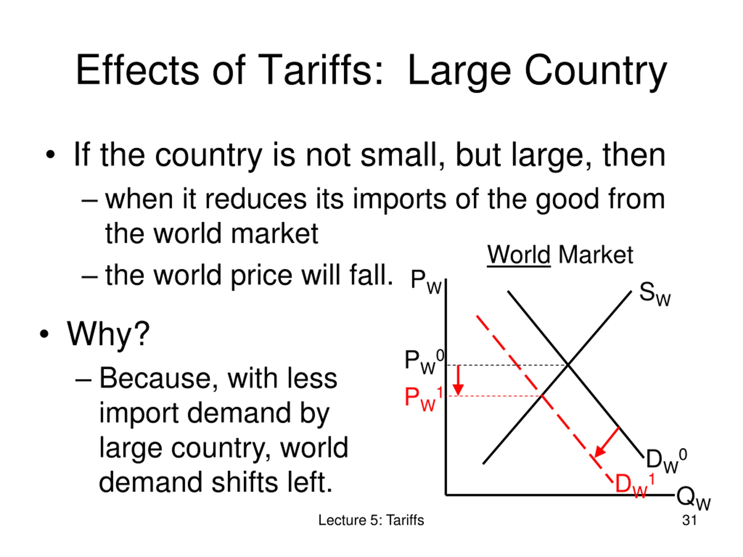 Outline: Tariffs What Are They? Who Uses Them? Effects of Tariffs Small Country Case Effects on quantities and prices Effects on economic welfare Large Country Case Effect on world price Effect on welfare Size of These Effects Addenda on Tariffs Lecture 5: Tariffs 30