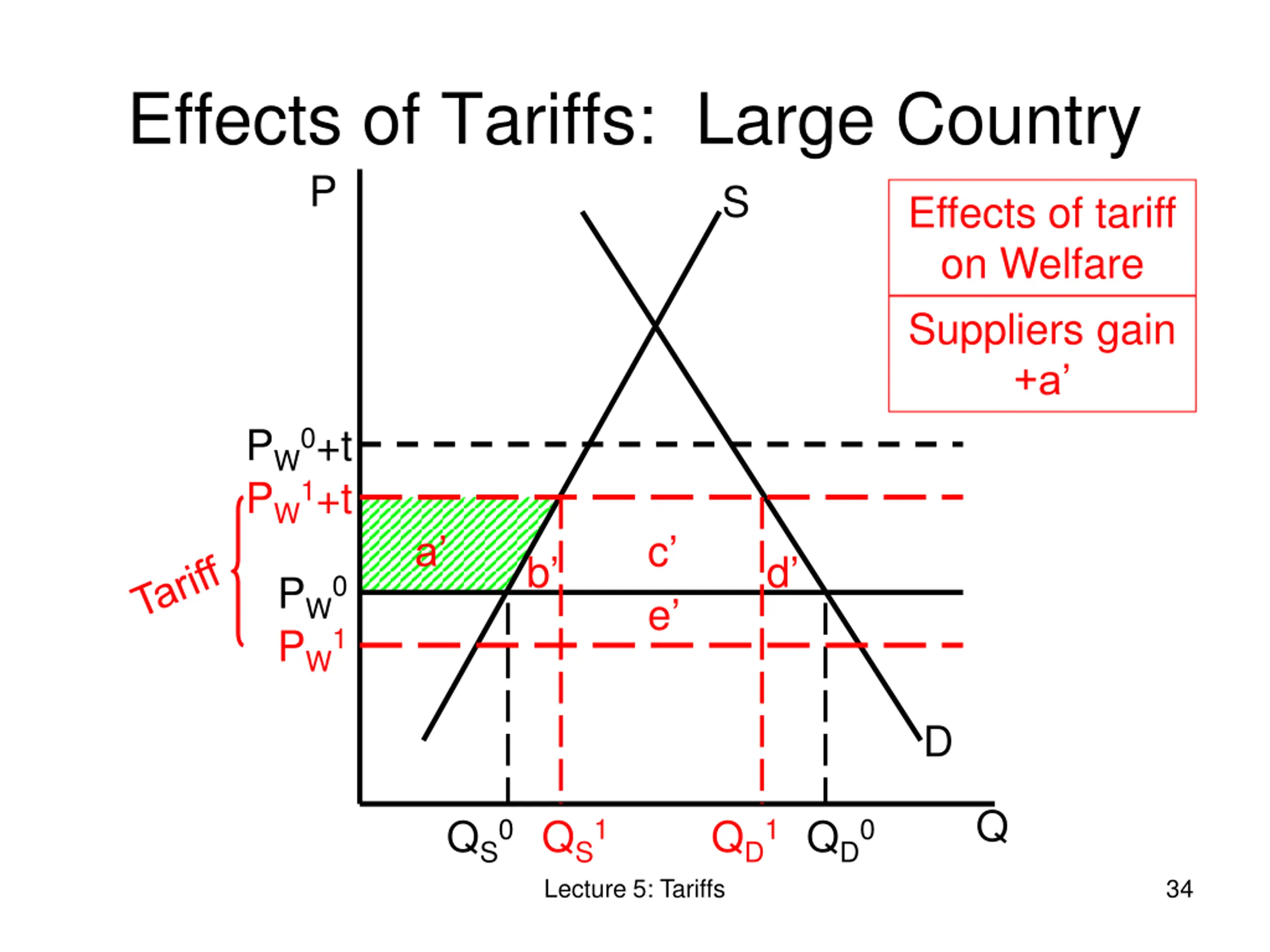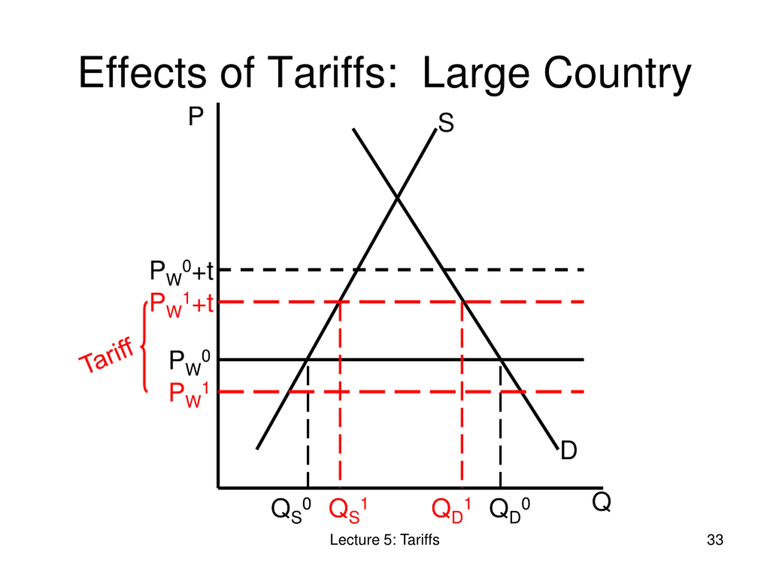 Effects of Tariffs: Large Country P S PW0+t PW1+t PW0 PW1 D Q QS0QS1 QD1QD0 Lecture 5: Tariffs 33