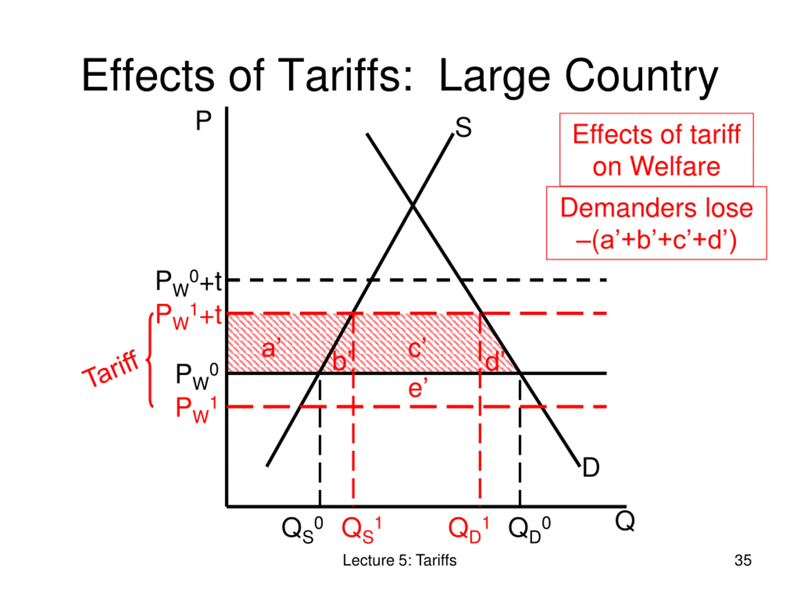 Effects of Tariffs: Large Country P S Effects of tariff on Welfare Suppliers gain +a PW0+t PW1+t c e a b d PW0 PW1 D Q QS0QS1 QD1QD0 Lecture 5: Tariffs 34