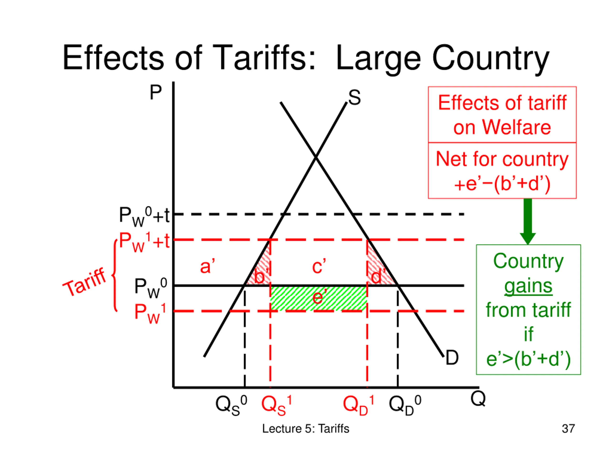 Effects of Tariffs: Large Country P S Effects of tariff on Welfare Government gains +(c +e ) PW0+t PW1+t c e a b d PW0 PW1 D Q QS0QS1 QD1QD0 Lecture 5: Tariffs 36