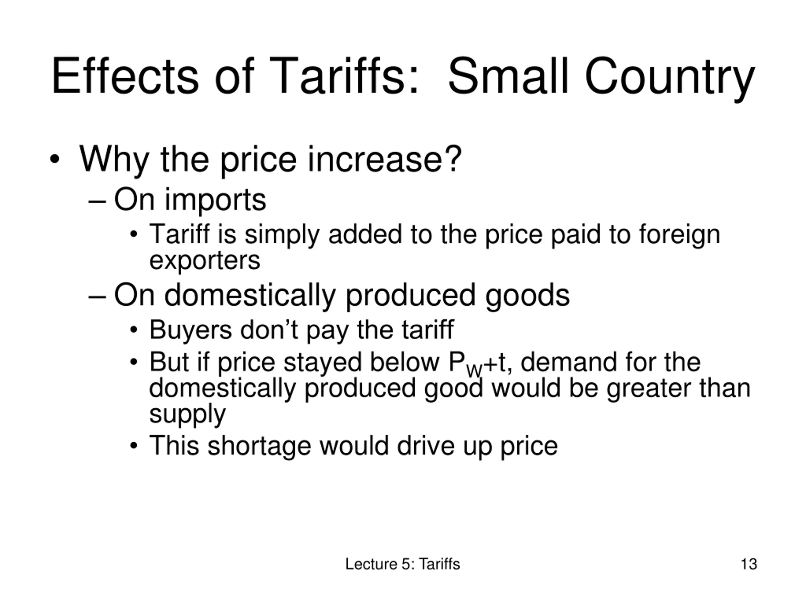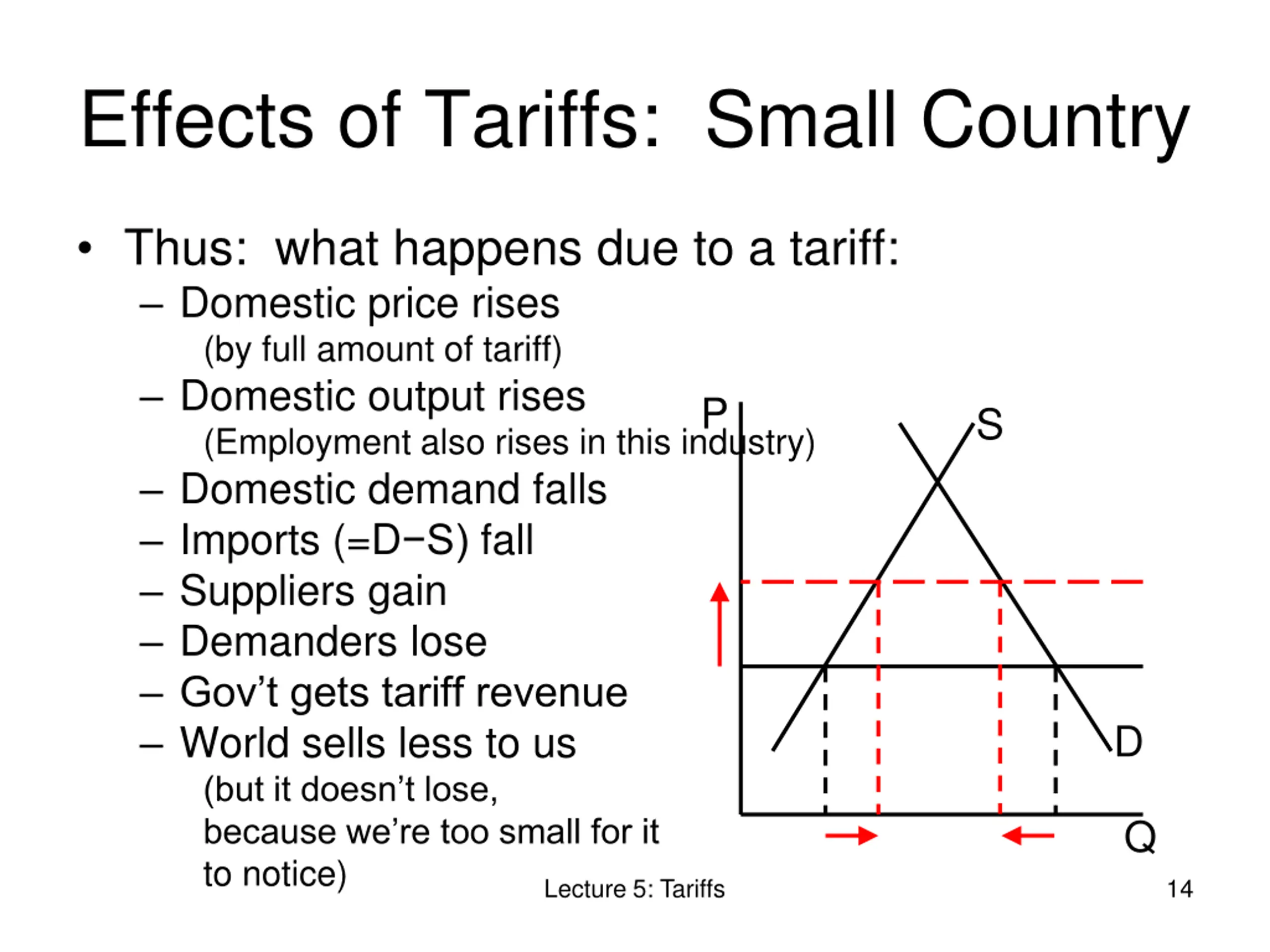 Effects of Tariffs: Small Country Why the price increase? On imports Tariff is simply added to the price paid to foreign exporters On domestically produced goods Buyers don t pay the tariff But if price stayed below PW+t, demand for the domestically produced good would be greater than supply This shortage would drive up price Lecture 5: Tariffs 13