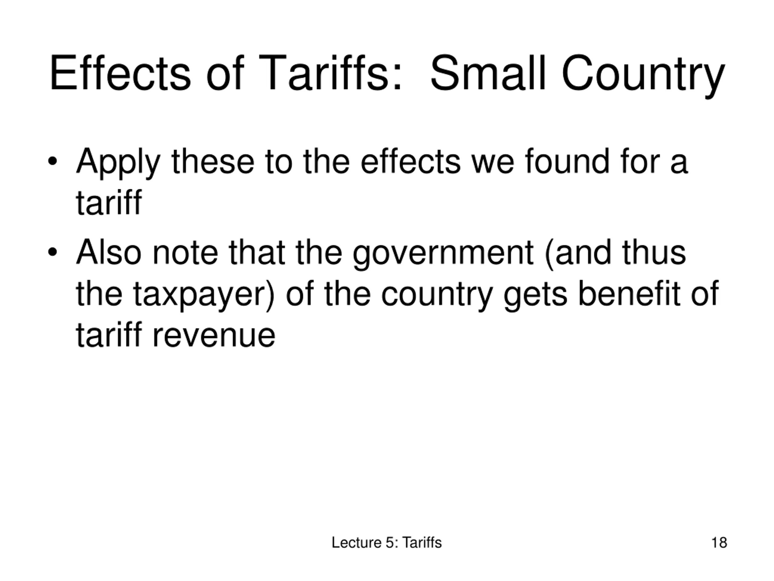 Effects of Tariffs: Small Country Apply these to the effects we found for a tariff Also note that the government (and thus the taxpayer) of the country gets benefit of tariff revenue Lecture 5: Tariffs 18