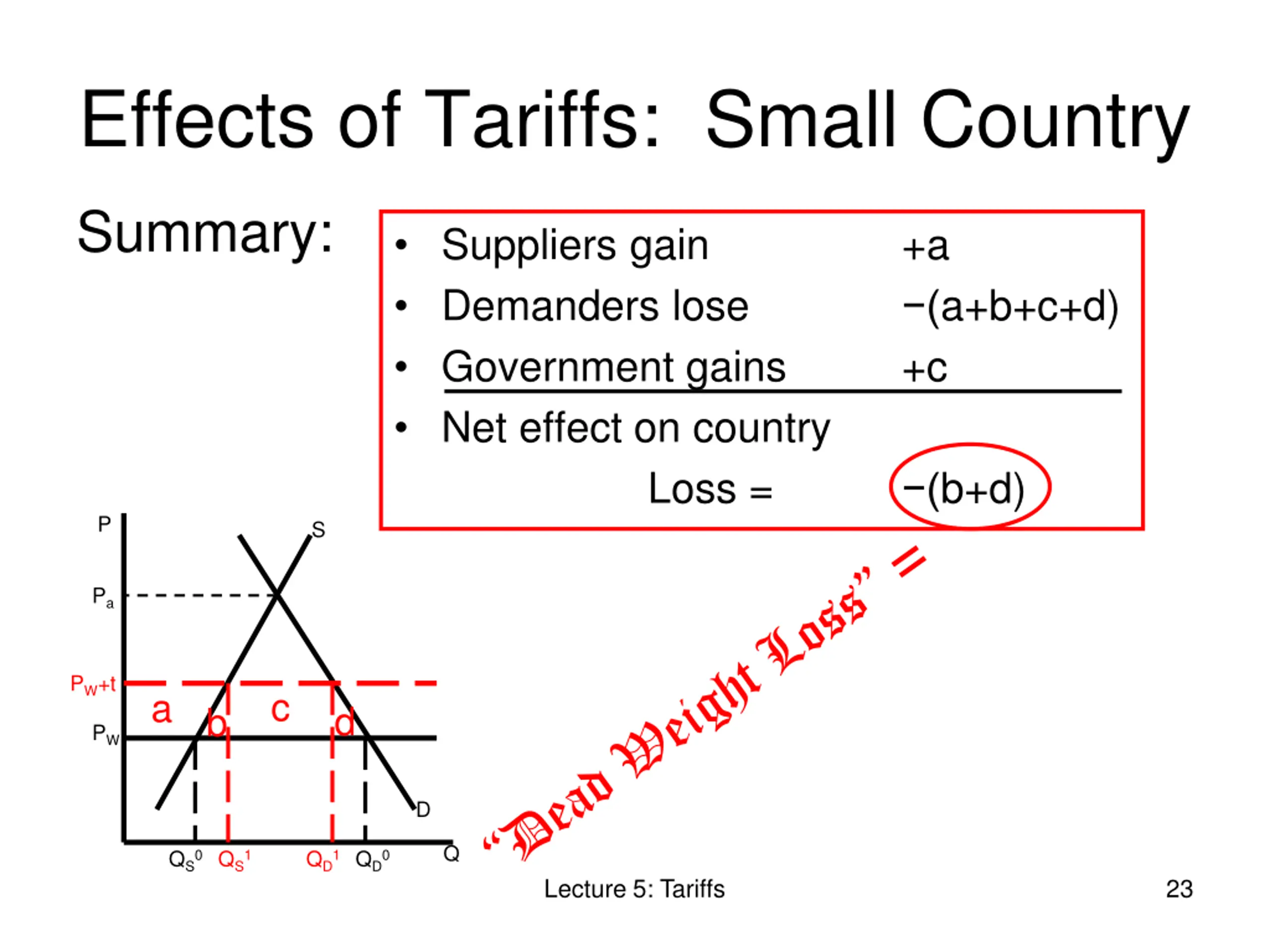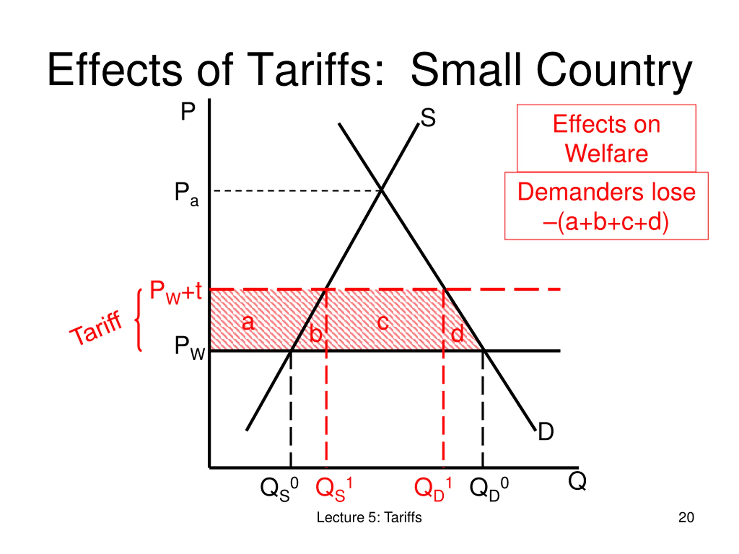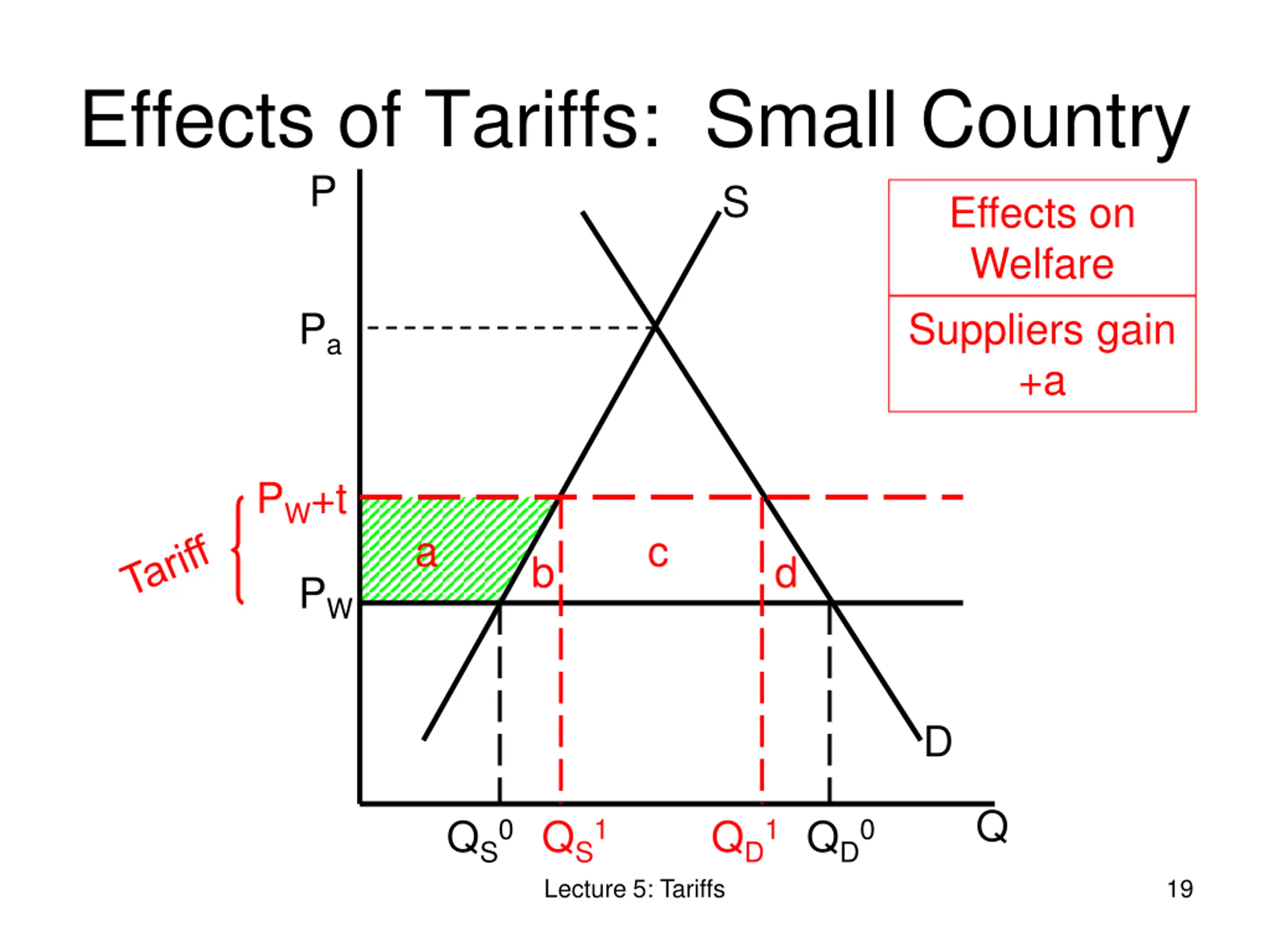 Effects of Tariffs: Small Country P S Effects on Welfare Suppliers gain +a Pa PW+t a c b d PW D Q QS0QS1 QD1QD0 Lecture 5: Tariffs 19