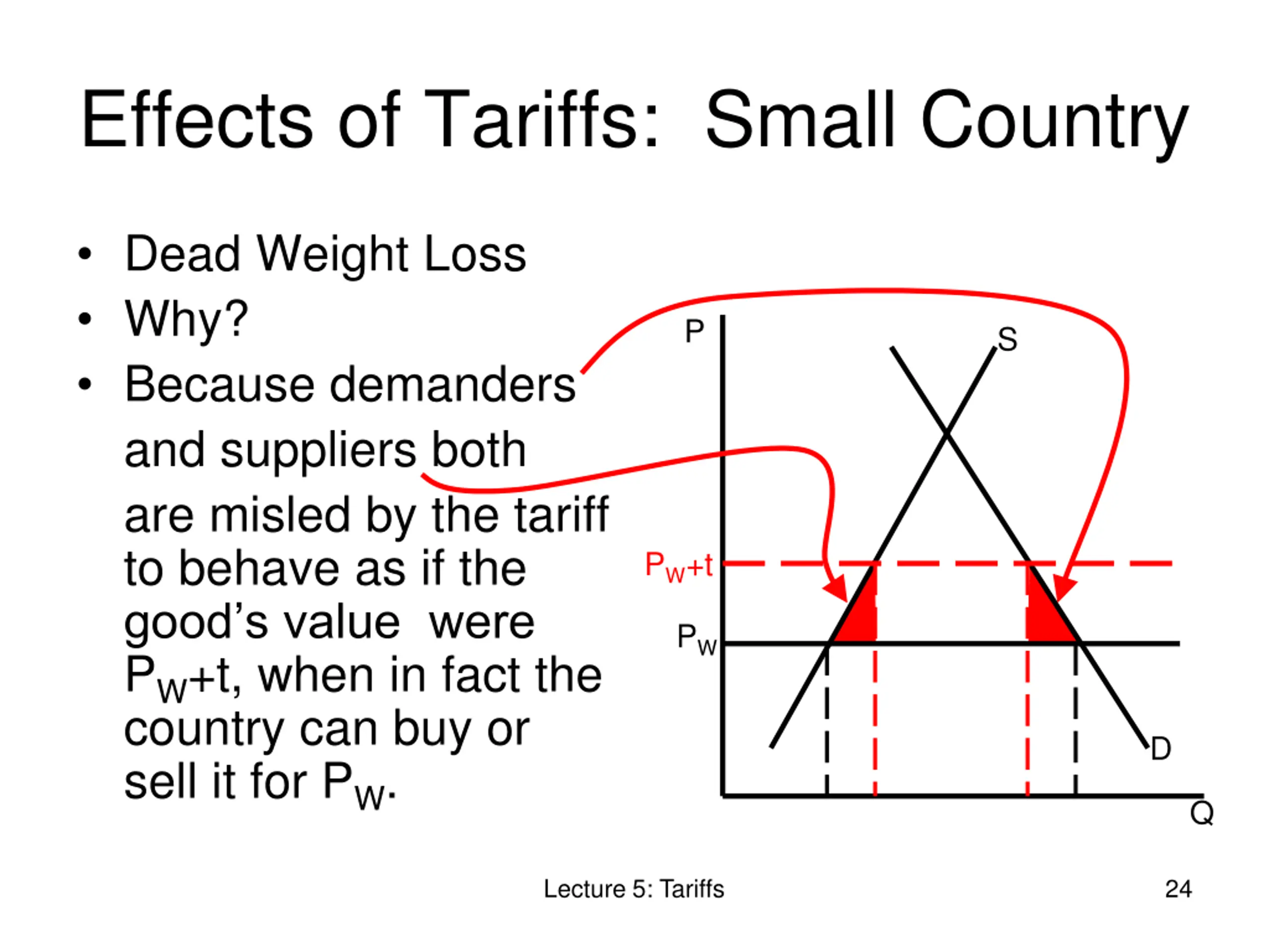 Effects of Tariffs: Small Country Dead Weight Loss Why? Because demanders and suppliers both are misled by the tariff to behave as if the good s value were PW+t, when in fact the country can buy or sell it for PW. P S PW+t PW D Q Lecture 5: Tariffs 24