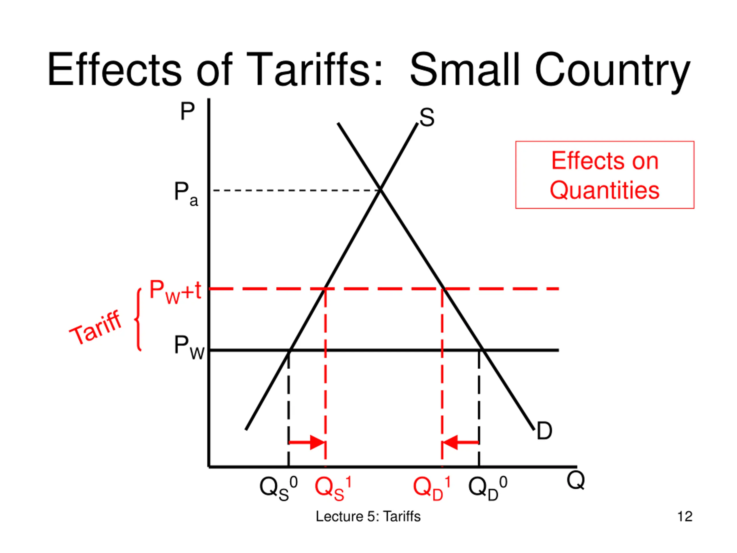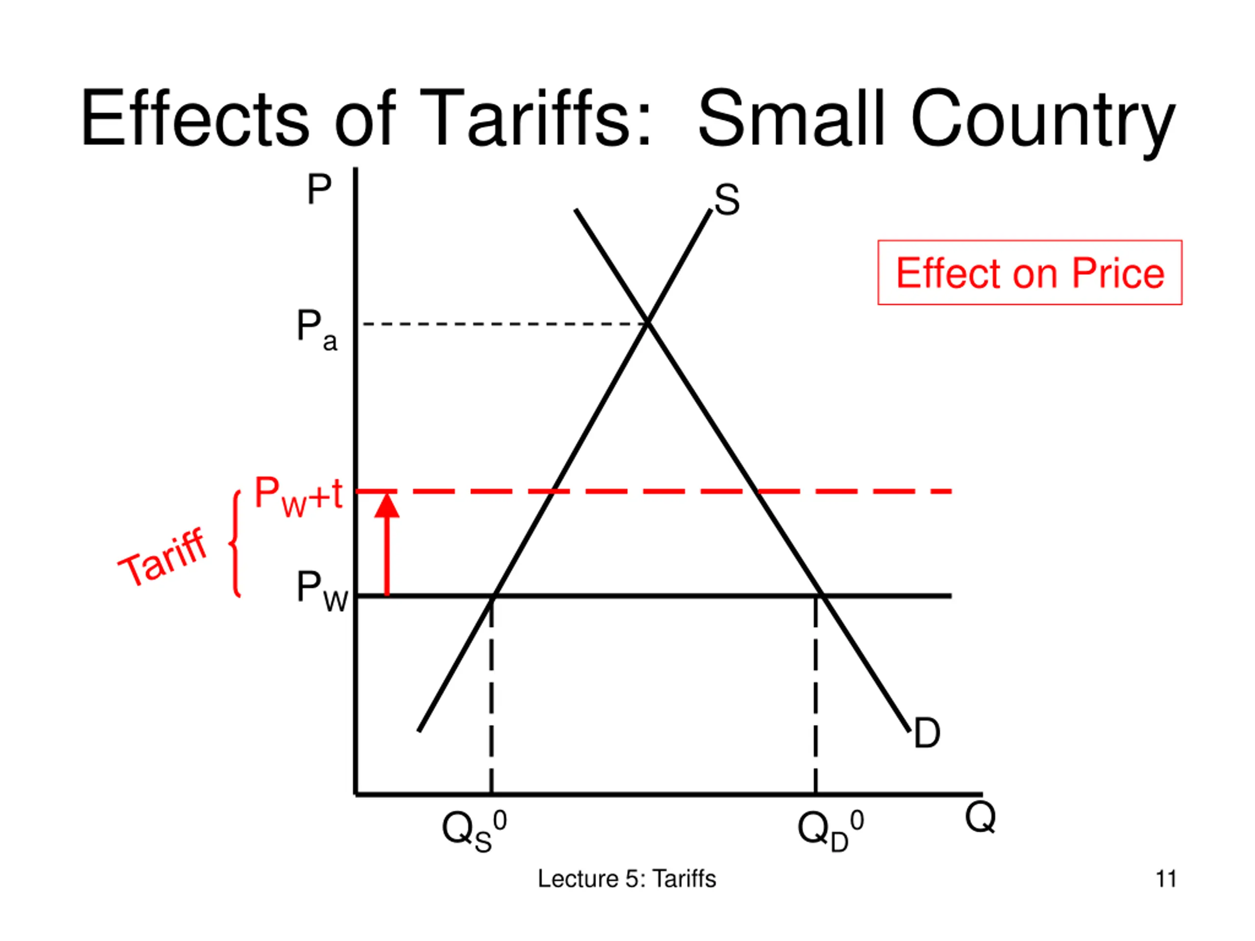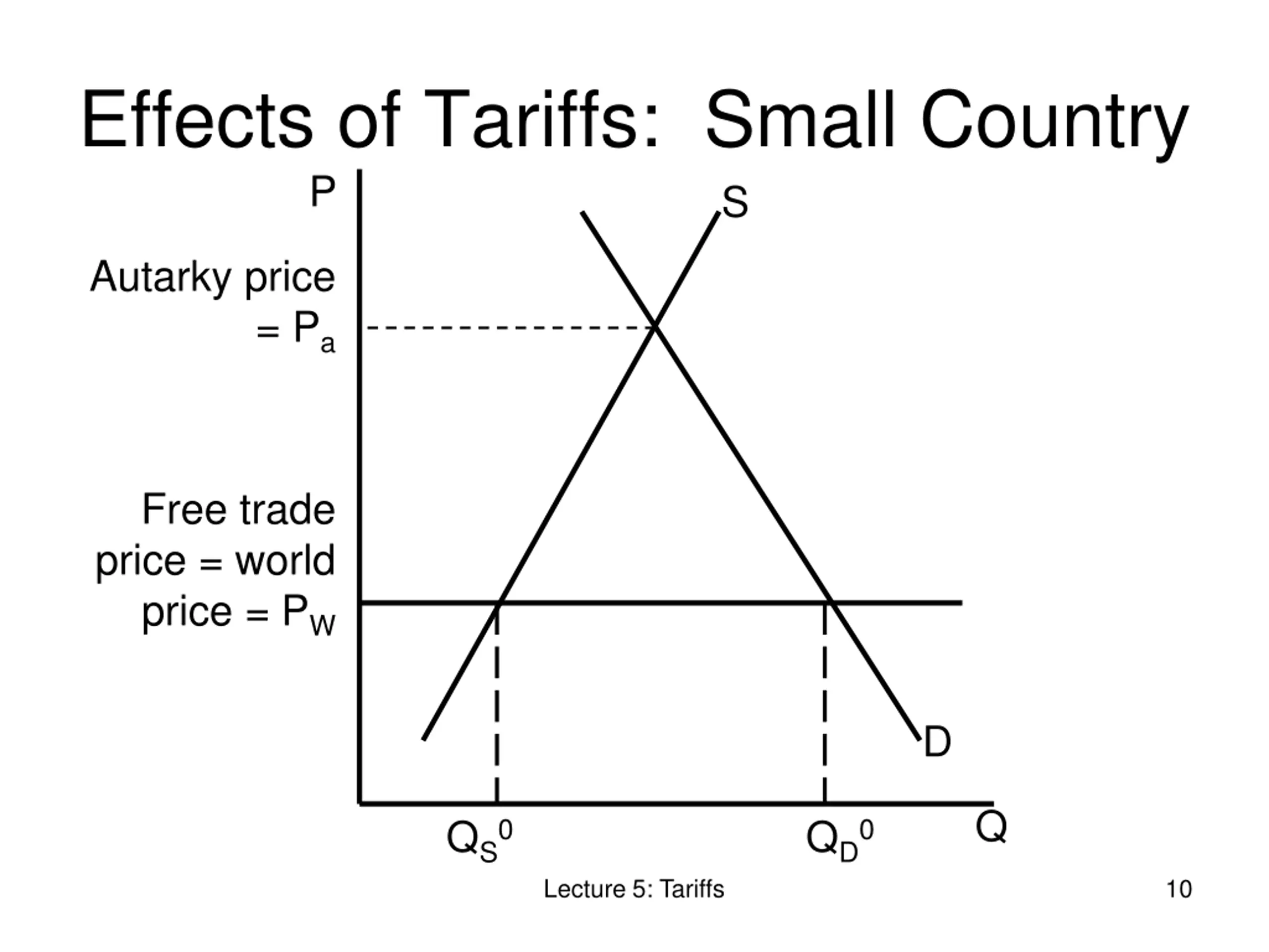 Effects of Tariffs: Small Country P S Autarky price = Pa Free trade price = world price = PW D Q QS0 QD0 Lecture 5: Tariffs 10