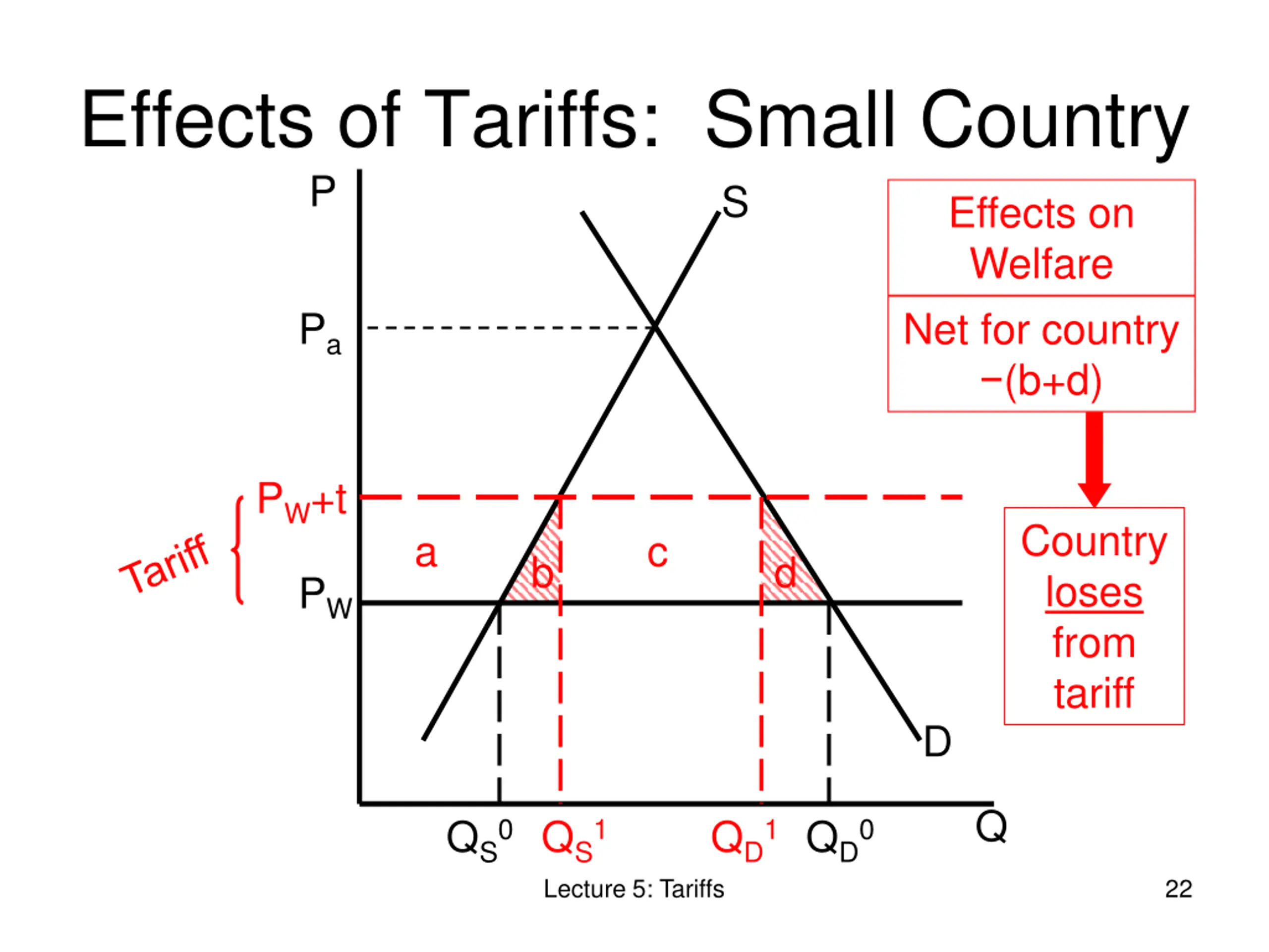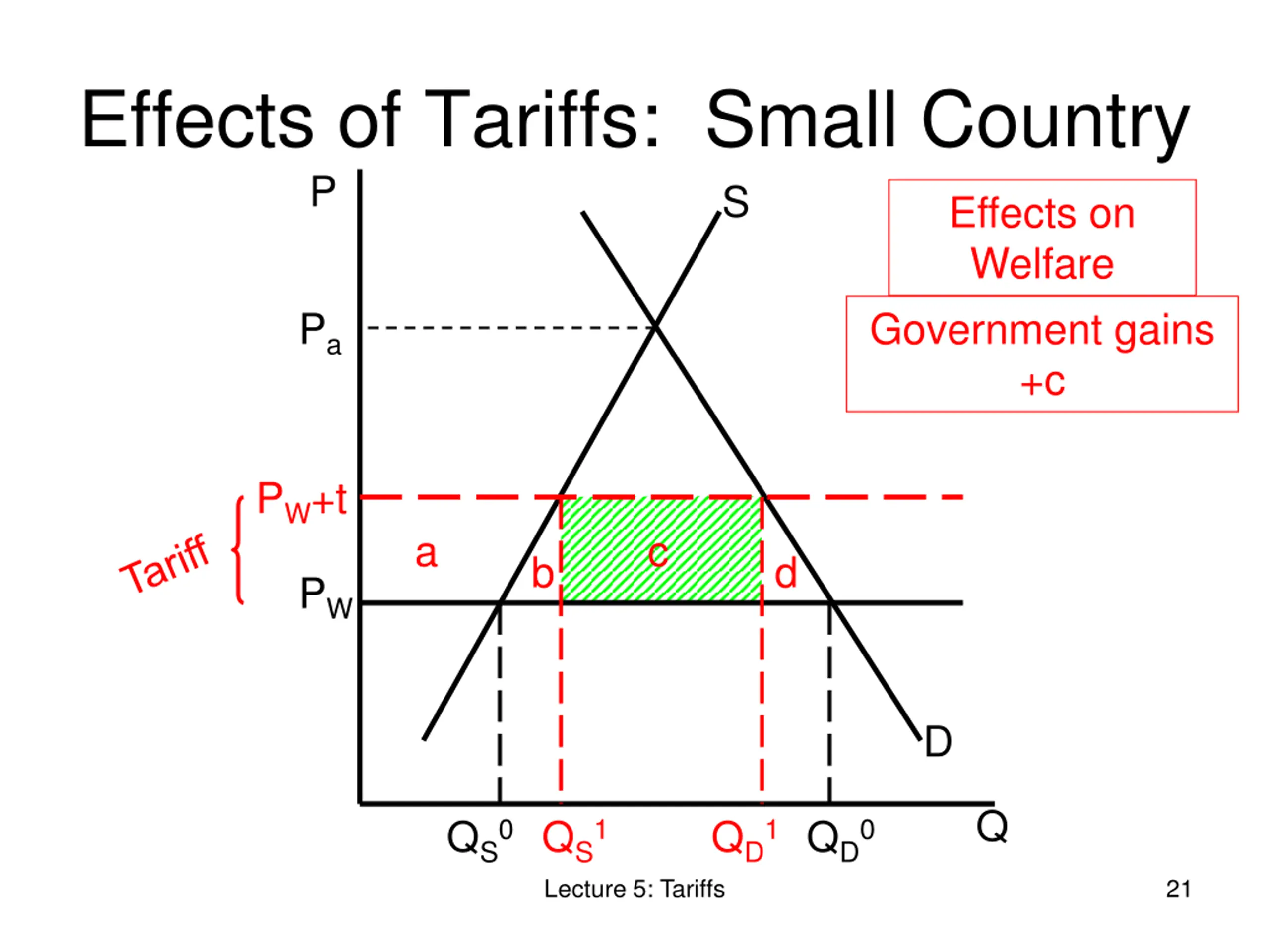 Effects of Tariffs: Small Country P S Effects on Welfare Government gains +c Pa PW+t a c b d PW D Q QS0QS1 QD1QD0 Lecture 5: Tariffs 21