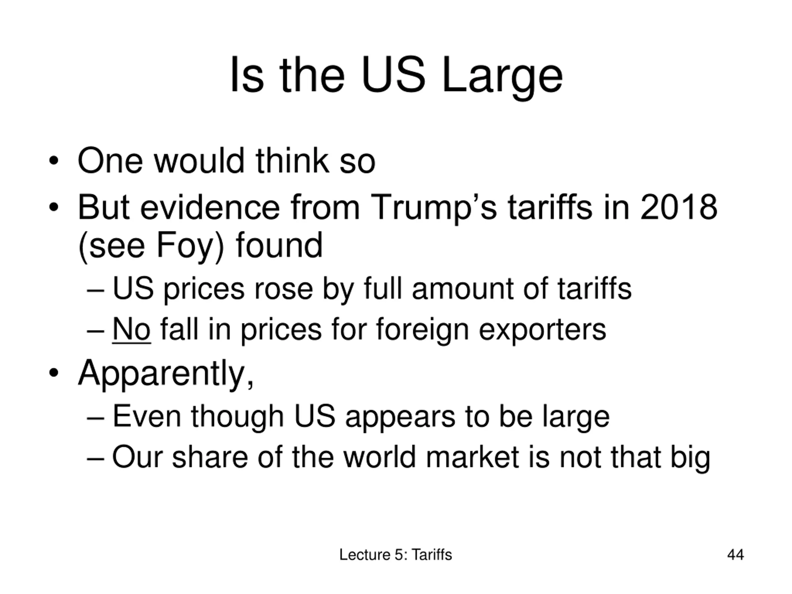 Is the US Large One would think so But evidence from Trump s tariffs in 2018 (see Foy) found US prices rose by full amount of tariffs No fall in prices for foreign exporters Apparently, Even though US appears to be large Our share of the world market is not that big Lecture 5: Tariffs 44