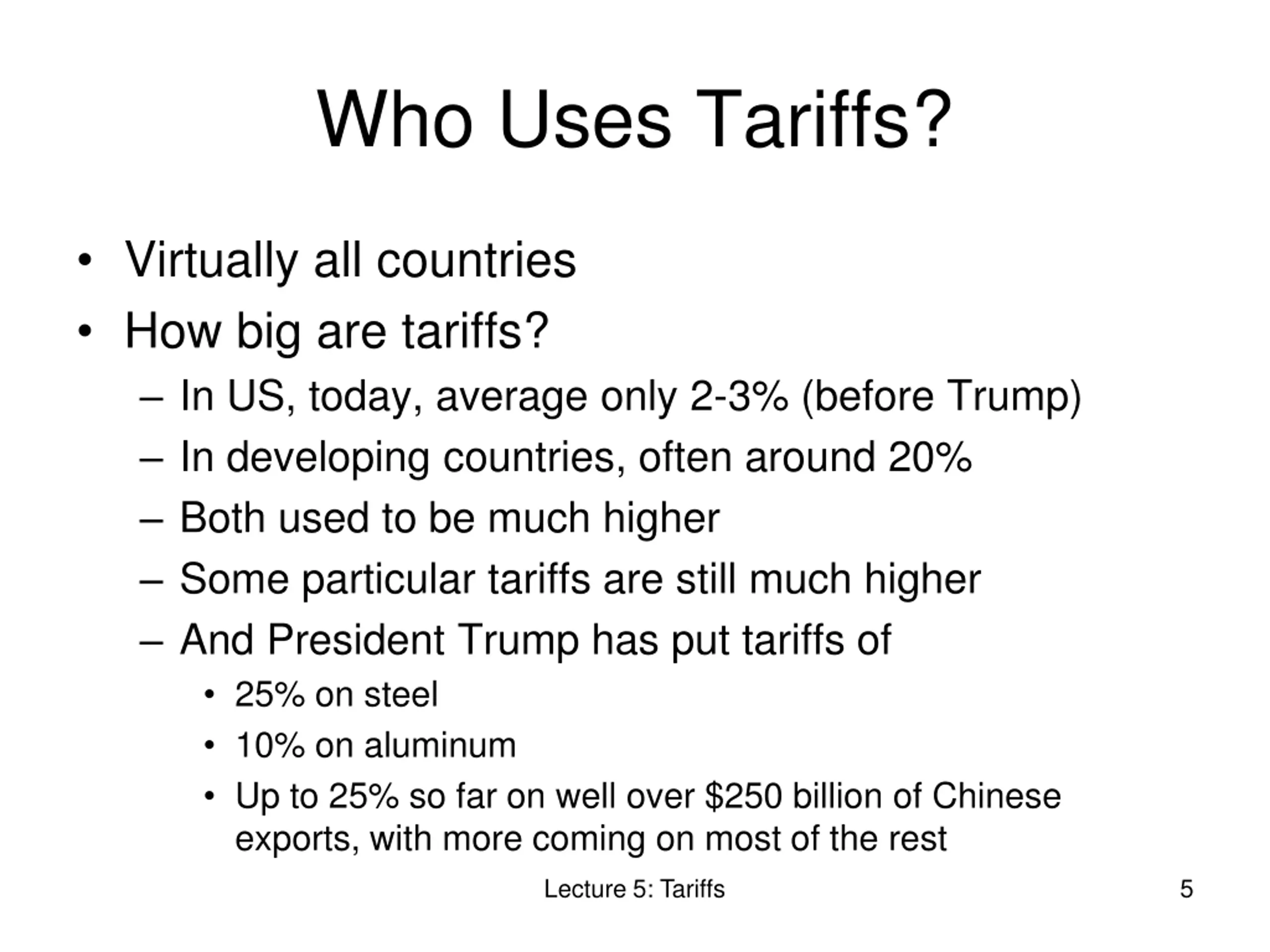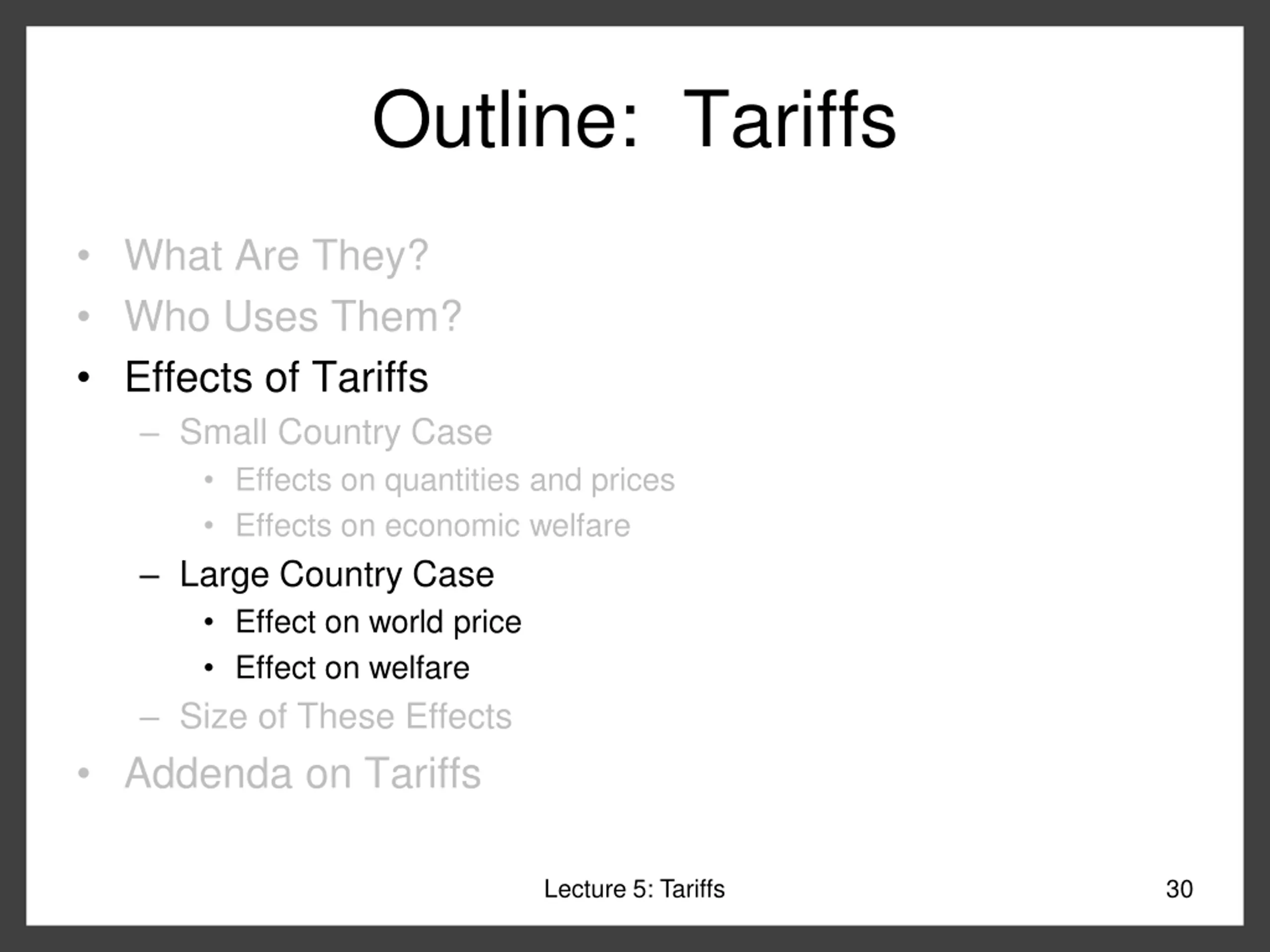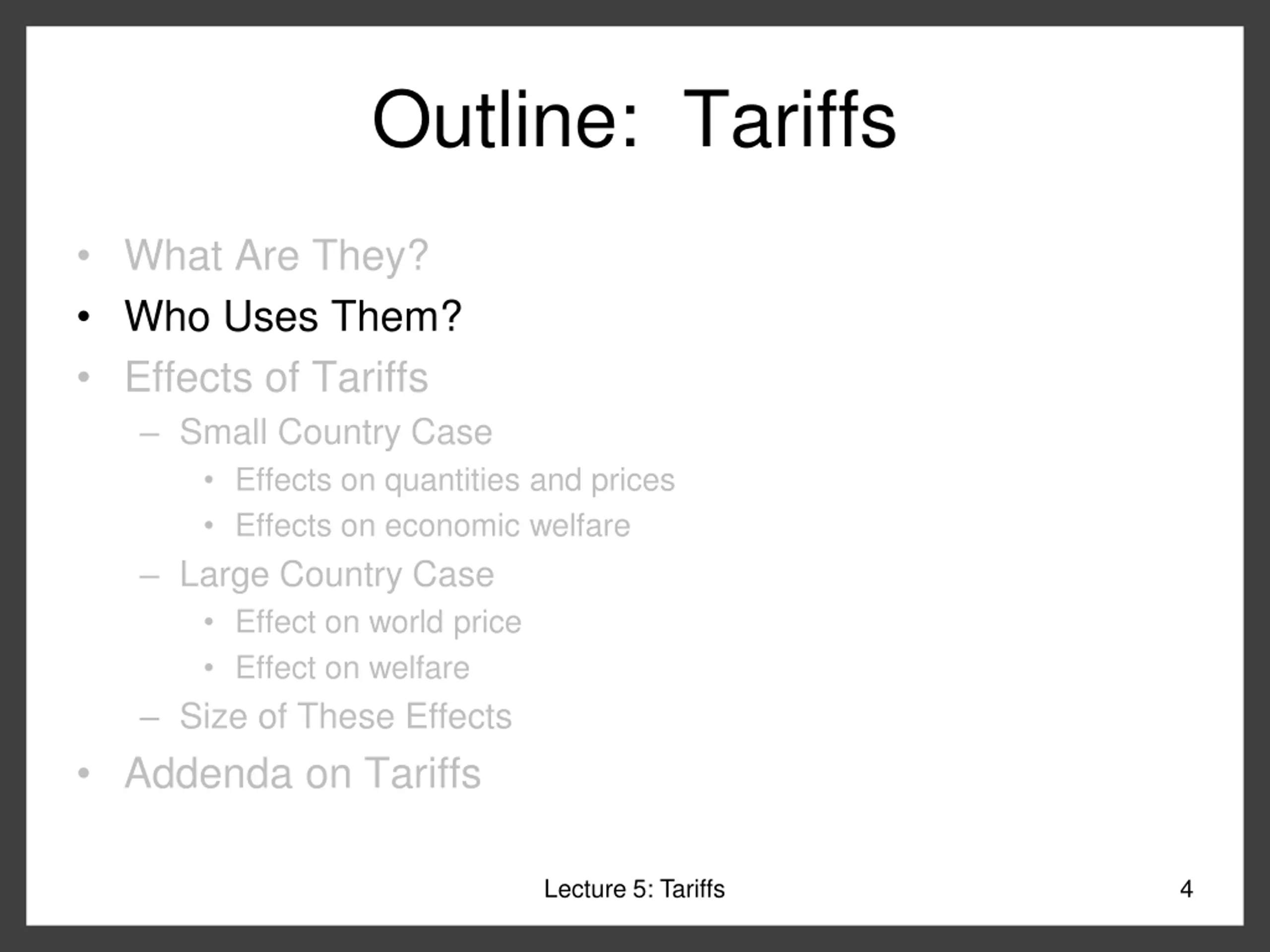 Outline: Tariffs What Are They? Who Uses Them? Effects of Tariffs Small Country Case Effects on quantities and prices Effects on economic welfare Large Country Case Effect on world price Effect on welfare Size of These Effects Addenda on Tariffs Lecture 5: Tariffs 4