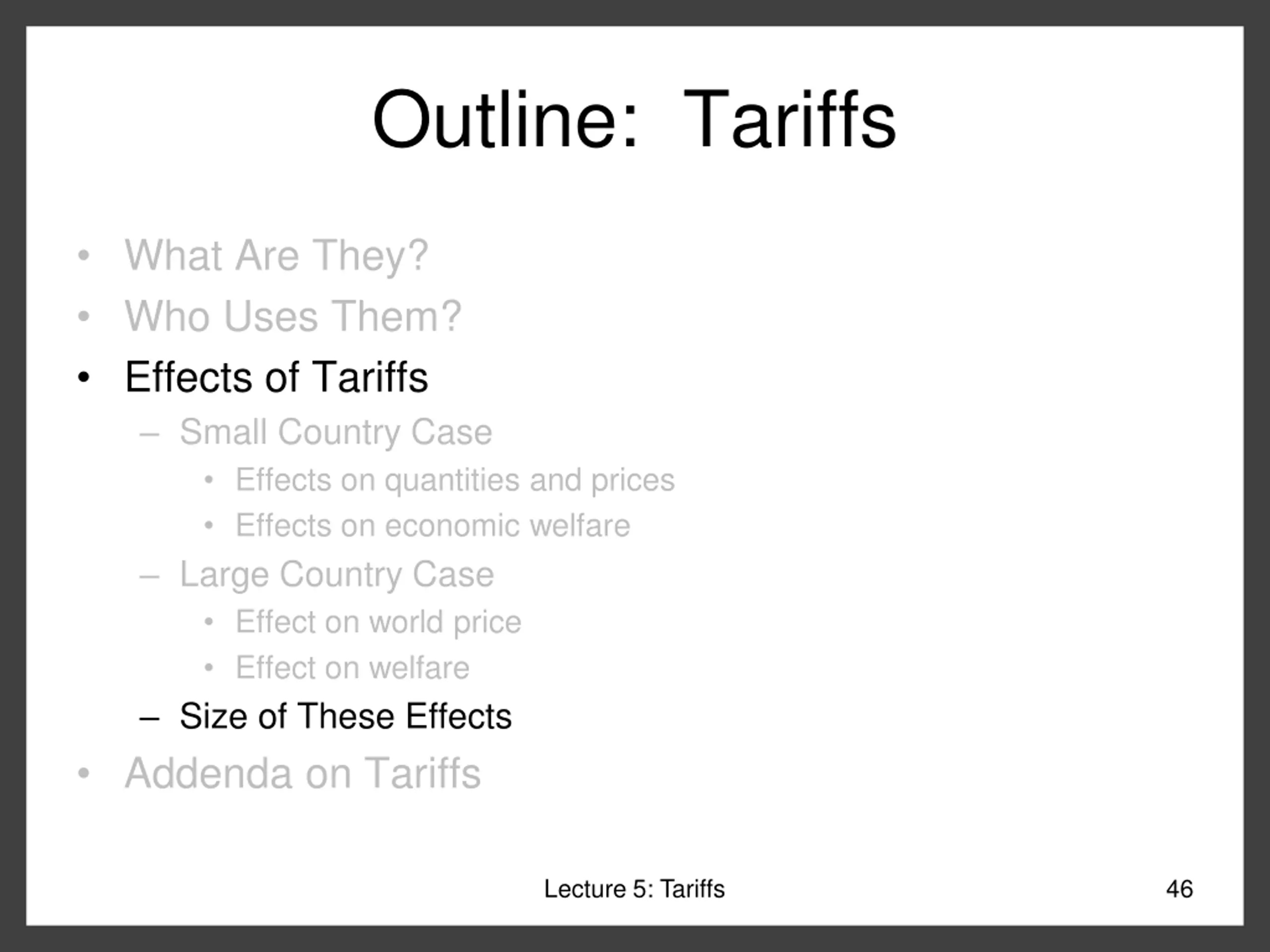 Outline: Tariffs What Are They? Who Uses Them? Effects of Tariffs Small Country Case Effects on quantities and prices Effects on economic welfare Large Country Case Effect on world price Effect on welfare Size of These Effects Addenda on Tariffs Lecture 5: Tariffs 46