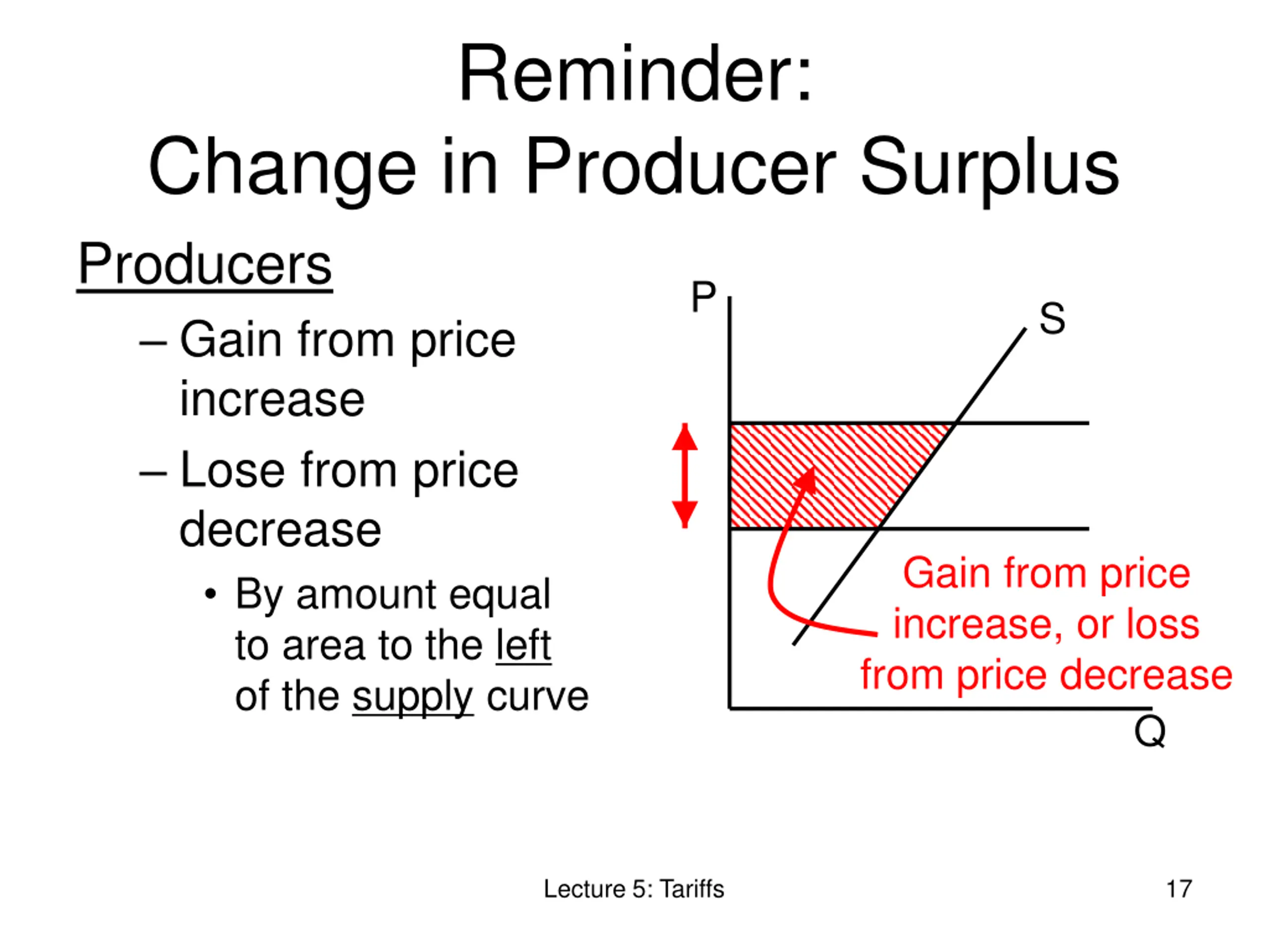 Reminder: Change in Producer Surplus Producers Gain from price increase Lose from price decrease By amount equal to area to the left of the supply curve P S Gain from price increase, or loss from price decrease Q Lecture 5: Tariffs 17