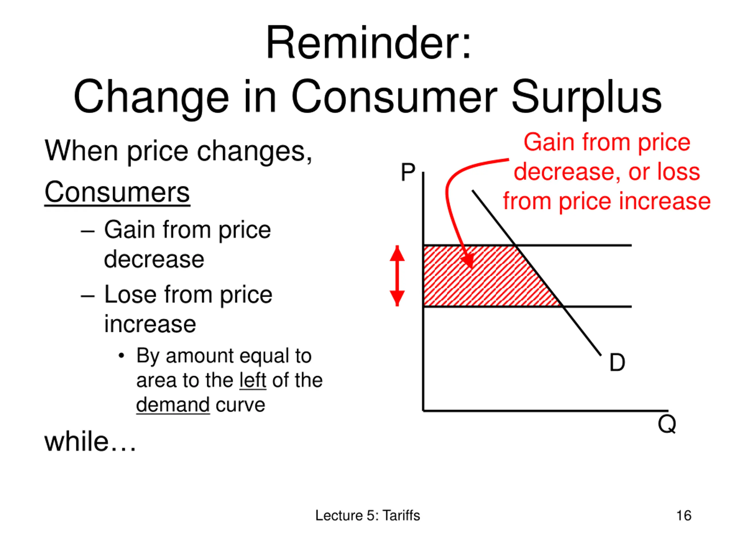 Reminder: Change in Consumer Surplus When price changes, Consumers Gain from price decrease Lose from price increase By amount equal to area to the left of the demand curve while Gain from price decrease, or loss from price increase P D Q Lecture 5: Tariffs 16