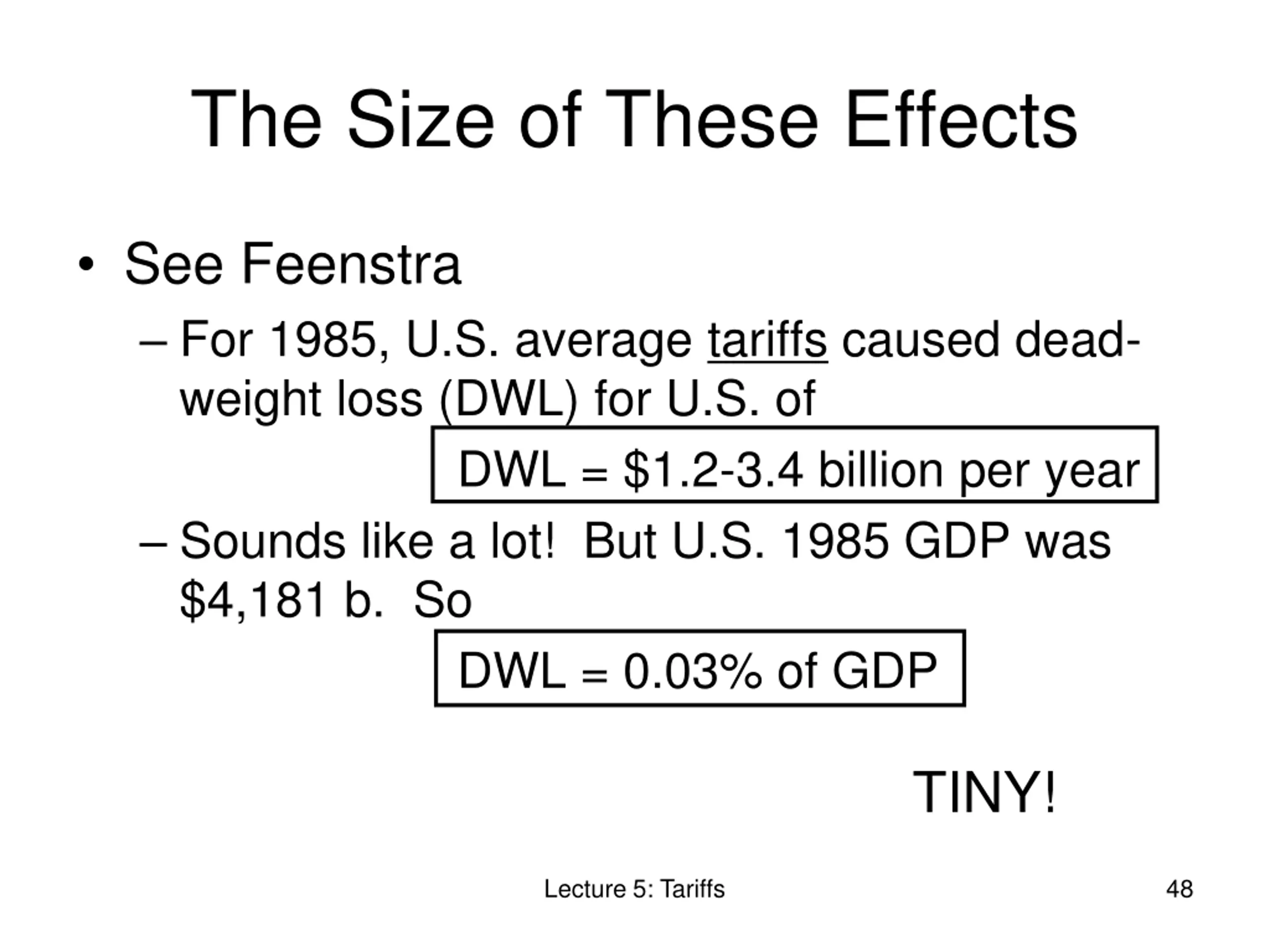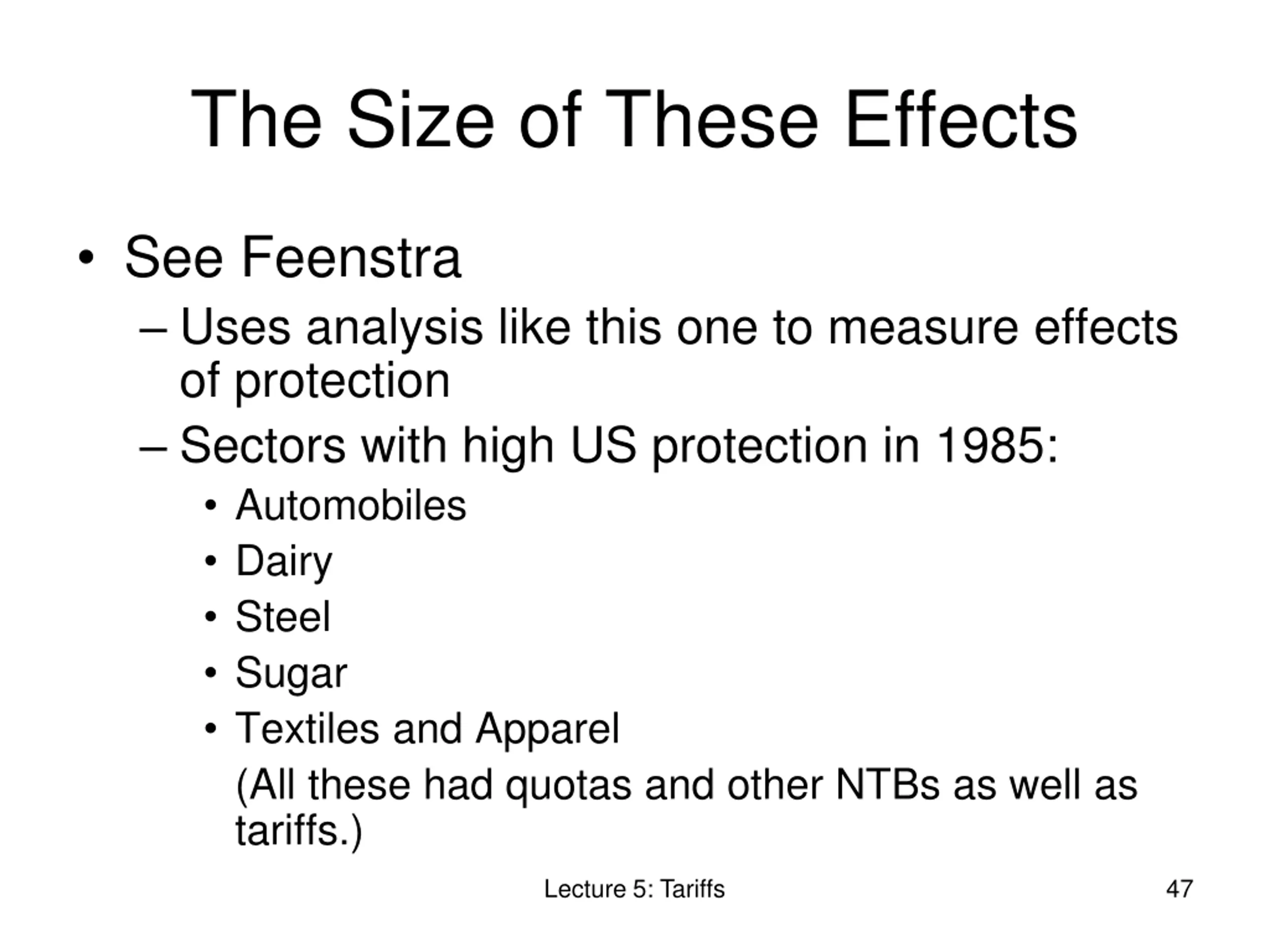 The Size of These Effects See Feenstra Uses analysis like this one to measure effects of protection Sectors with high US protection in 1985: Automobiles Dairy Steel Sugar Textiles and Apparel (All these had quotas and other NTBs as well as tariffs.) Lecture 5: Tariffs 47