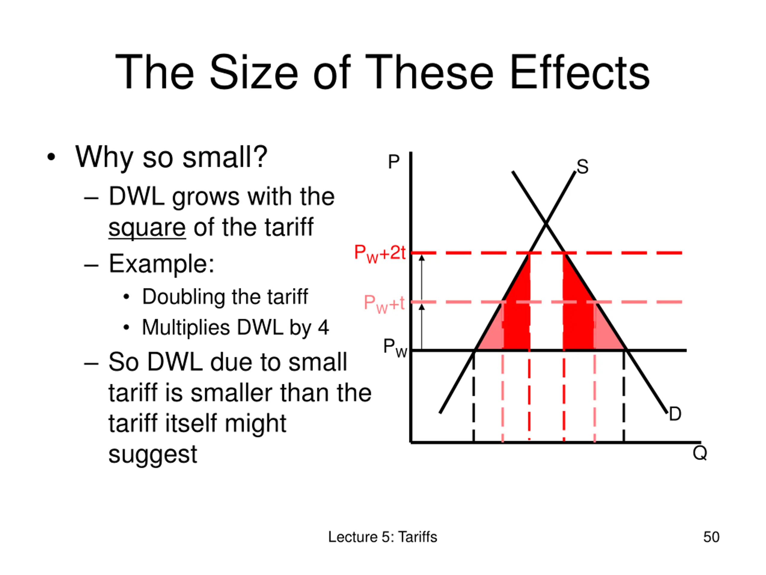 The Size of These Effects Why so small? DWL grows with the square of the tariff Example: Doubling the tariff Multiplies DWL by 4 So DWL due to small tariff is smaller than the tariff itself might suggest P S PW+2t PW+t PW D Q Lecture 5: Tariffs 50