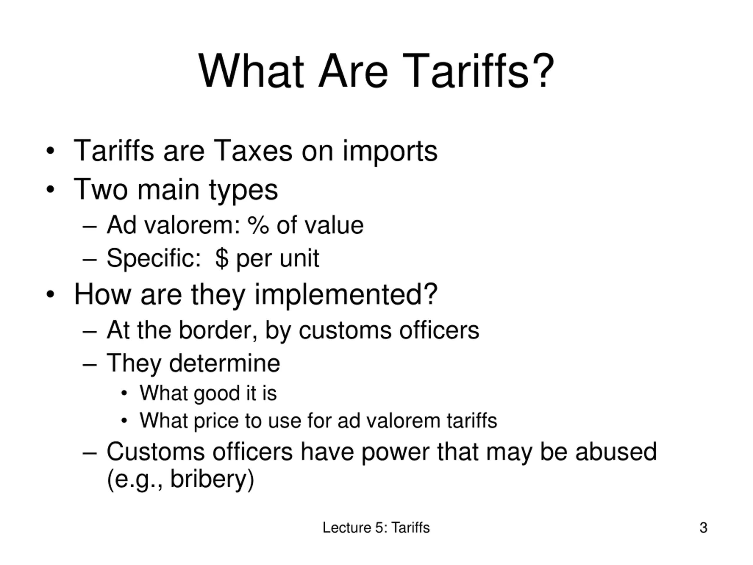 What Are Tariffs? Tariffs are Taxes on imports Two main types Ad valorem: % of value Specific: $ per unit How are they implemented? At the border, by customs officers They determine What good it is What price to use for ad valorem tariffs Customs officers have power that may be abused (e.g., bribery) Lecture 5: Tariffs 3
