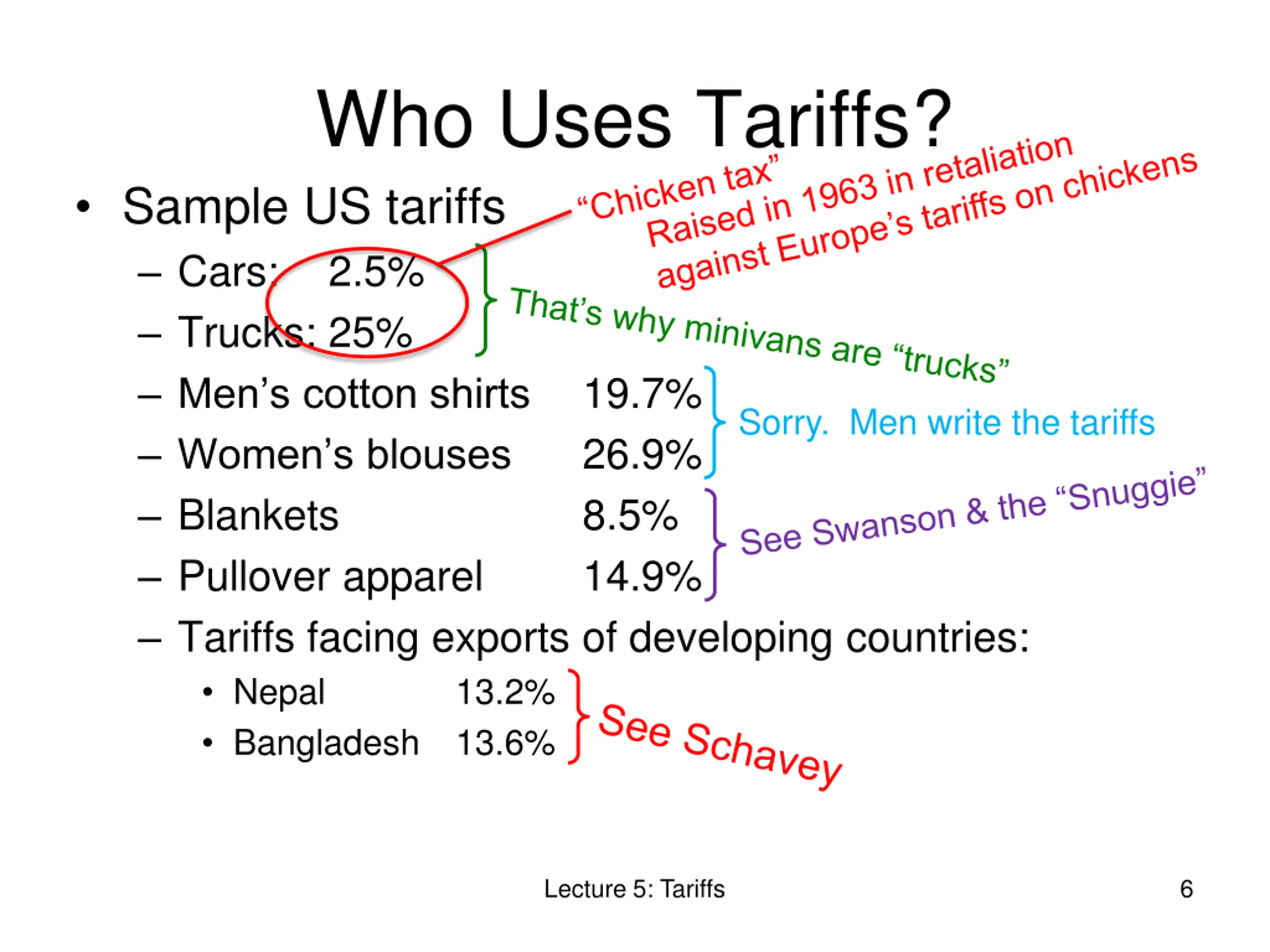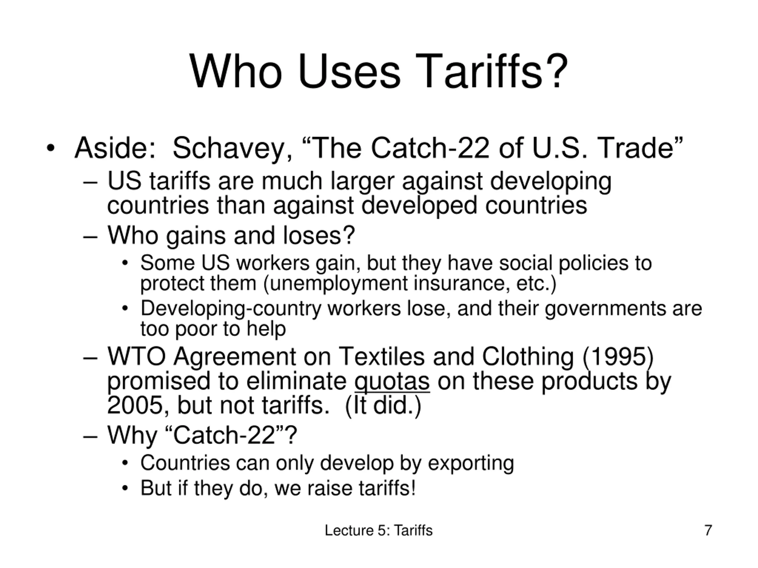 Who Uses Tariffs? Sample US tariffs Cars: 2.5% Trucks: 25% Men s cotton shirts Women s blouses Blankets Pullover apparel Tariffs facing exports of developing countries: Nepal 13.2% Bangladesh 13.6% 19.7% 26.9% 8.5% 14.9% Sorry. Men write the tariffs Lecture 5: Tariffs 6