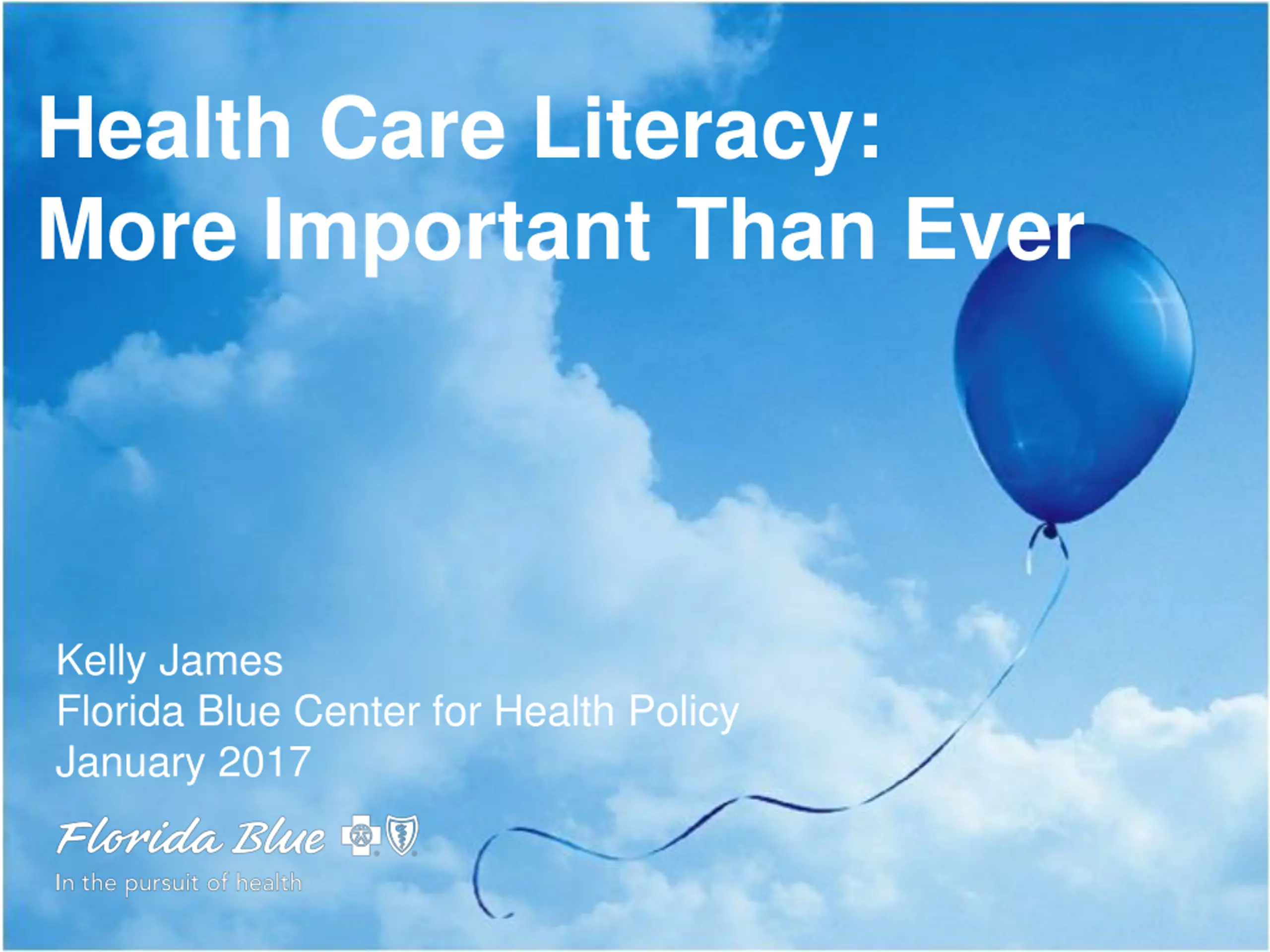 Health Care Literacy: More Important Than Ever Kelly James Florida Blue Center for Health Policy January 2017