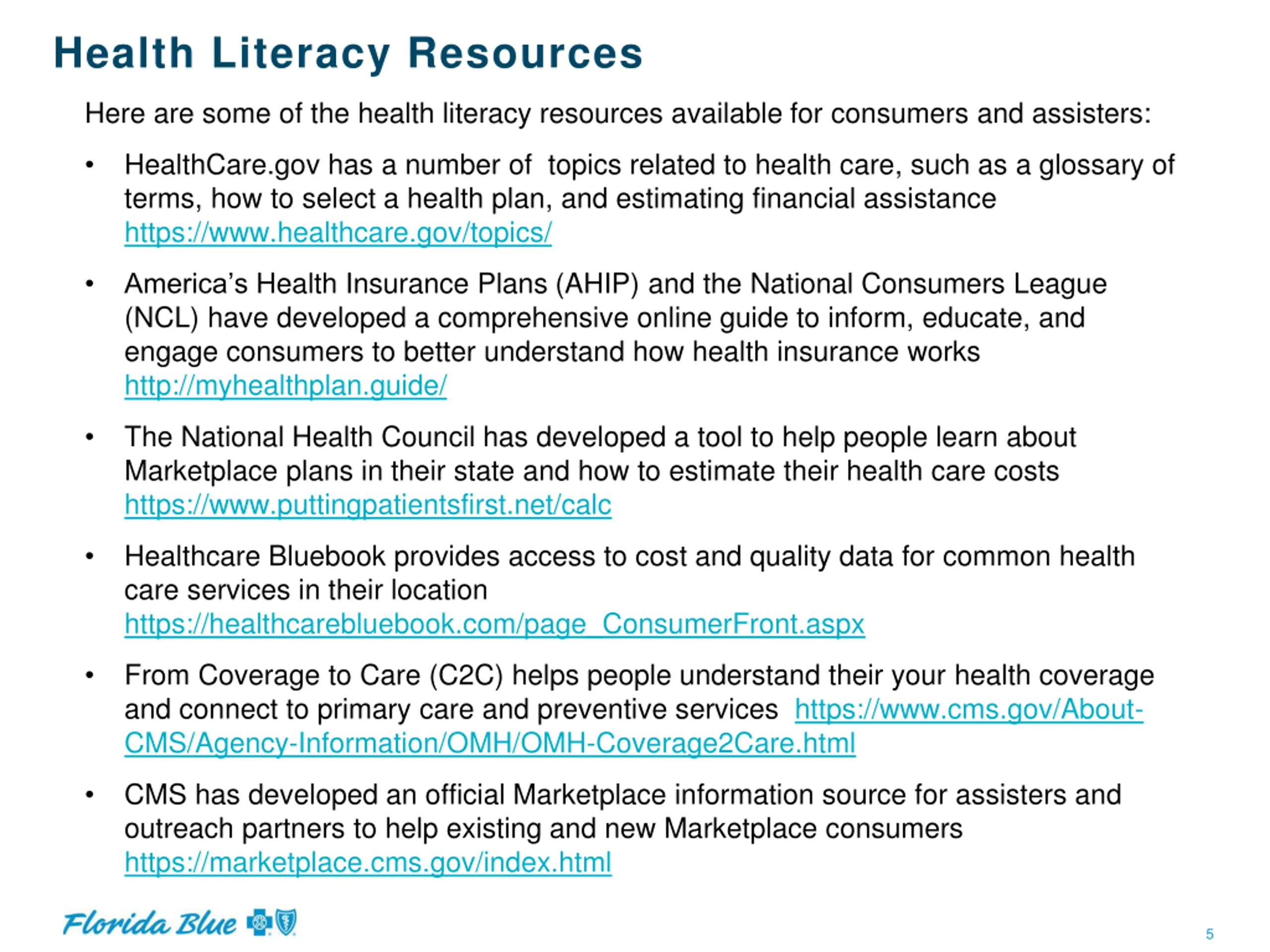 Health Literacy Resources Here are some of the health literacy resources available for consumers and assisters: HealthCare.gov has a number of topics related to health care, such as a glossary of terms, how to select a health plan, and estimating financial assistance https://www.healthcare.gov/topics/ America s Health Insurance Plans (AHIP) and the National Consumers League (NCL) have developed a comprehensive online guide to inform, educate, and engage consumers to better understand how health insurance works http://myhealthplan.guide/ The National Health Council has developed a tool to help people learn about Marketplace plans in their state and how to estimate their health care costs https://www.puttingpatientsfirst.net/calc Healthcare Bluebook provides access to cost and quality data for common health care services in their location https://healthcarebluebook.com/page_ConsumerFront.aspx From Coverage to Care (C2C) helps people understand their your health coverage and connect to primary care and preventive services https://www.cms.gov/About- CMS/Agency-Information/OMH/OMH-Coverage2Care.html CMS has developed an official Marketplace information source for assisters and outreach partners to help existing and new Marketplace consumers https://marketplace.cms.gov/index.html 5