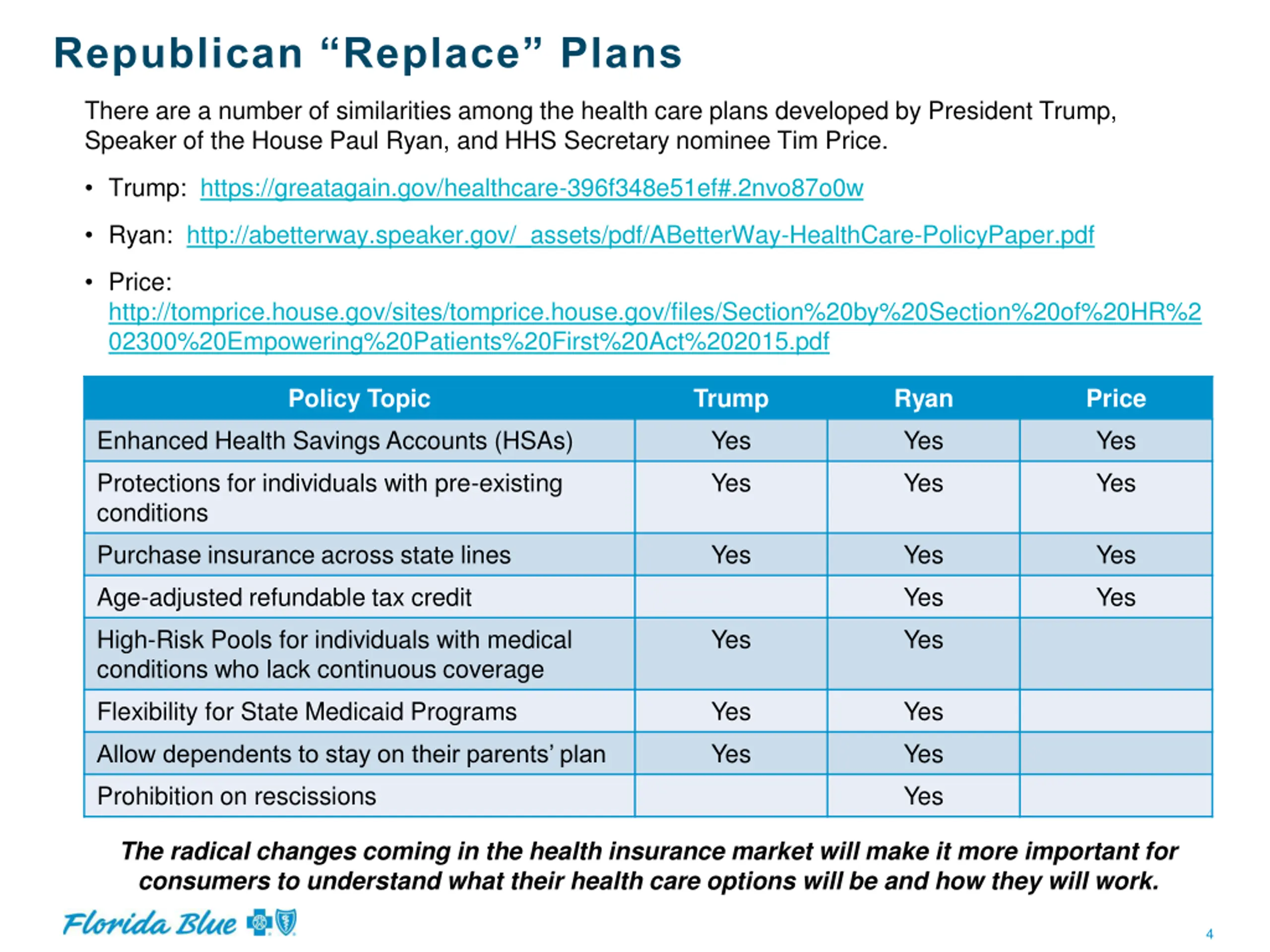 Repeal of the Affordable Care Act (ACA) The Trump administration has made the repeal and replacement of the Affordable Care Act (ACA) one of their top priorities. The House is likely to use legislation previously vetoed by President Obama as the starting point for repeal of the ACA through the budget reconciliation process. This legislation eliminates federal funding for premium tax credits, cost-sharing reduction payments, and Medicaid expansion after a two-year delay. It also eliminates individual and employer mandates and related penalties, the medical device tax, the health insurer tax, and the Cadillac tax. The budget reconciliation process only requires a simple majority (51 votes) for approval and limits the time spent on debate. However, this process is restricted to items that have a direct impact on federal spending. Regulatory changes such as modifications to benefit requirements, rating rules, etc. will have to be made through formal legislation that will require 60 House votes in order to move forward. These efforts will begin later in 2017. Even with passage of a budget reconciliation bill, the ACA and related financial assistance will not repealed immediately. Republicans are proposing a two to three year transition period to prevent market disruption and allow for development of the replace plan, as well as options to continue related financial assistance. 3