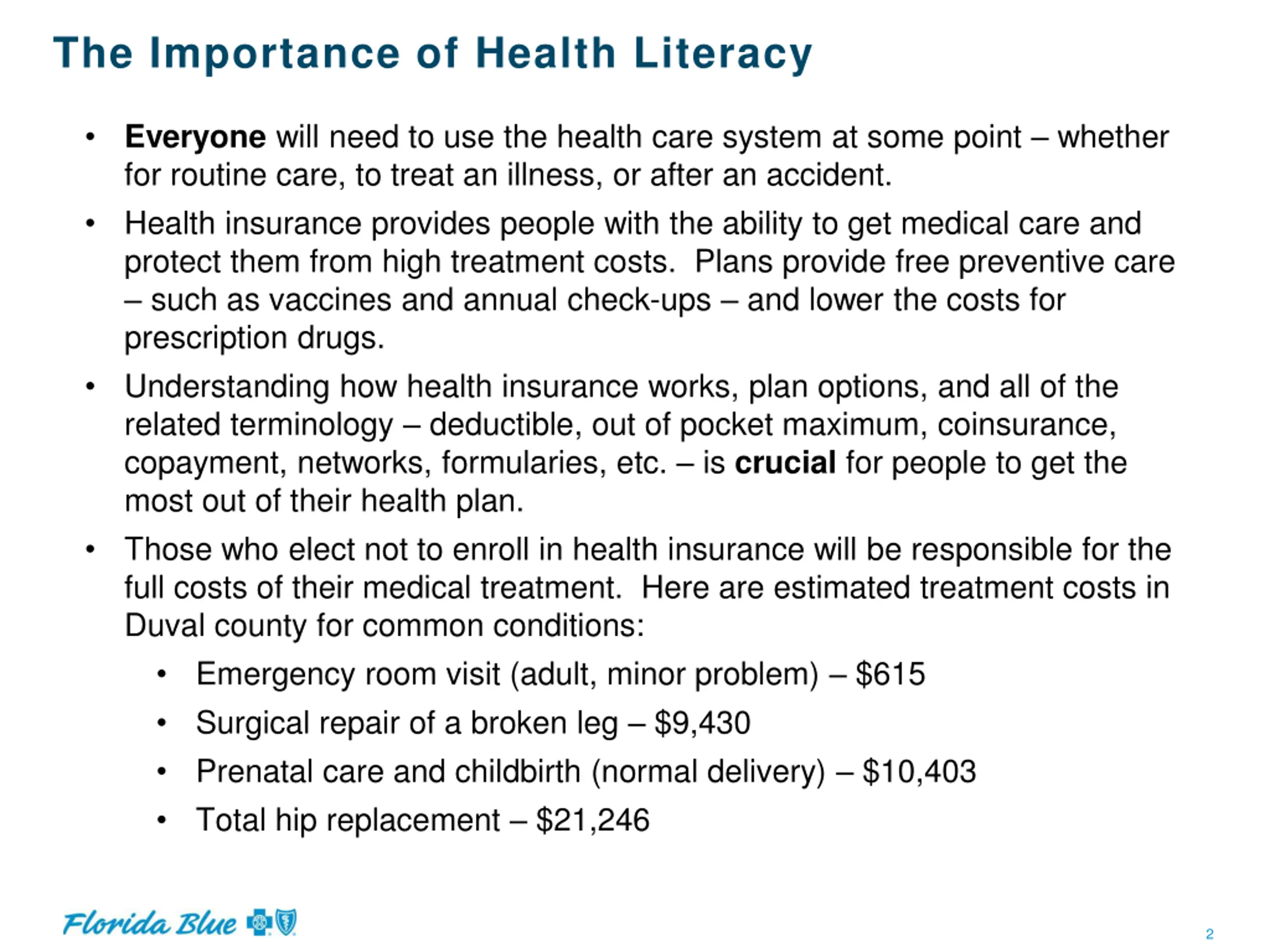The Importance of Health Literacy Everyone will need to use the health care system at some point whether for routine care, to treat an illness, or after an accident. Health insurance provides people with the ability to get medical care and protect them from high treatment costs. Plans provide free preventive care such as vaccines and annual check-ups and lower the costs for prescription drugs. Understanding how health insurance works, plan options, and all of the related terminology deductible, out of pocket maximum, coinsurance, copayment, networks, formularies, etc. is crucial for people to get the most out of their health plan. Those who elect not to enroll in health insurance will be responsible for the full costs of their medical treatment. Here are estimated treatment costs in Duval county for common conditions: Emergency room visit (adult, minor problem) $615 Surgical repair of a broken leg $9,430 Prenatal care and childbirth (normal delivery) $10,403 Total hip replacement $21,246 2
