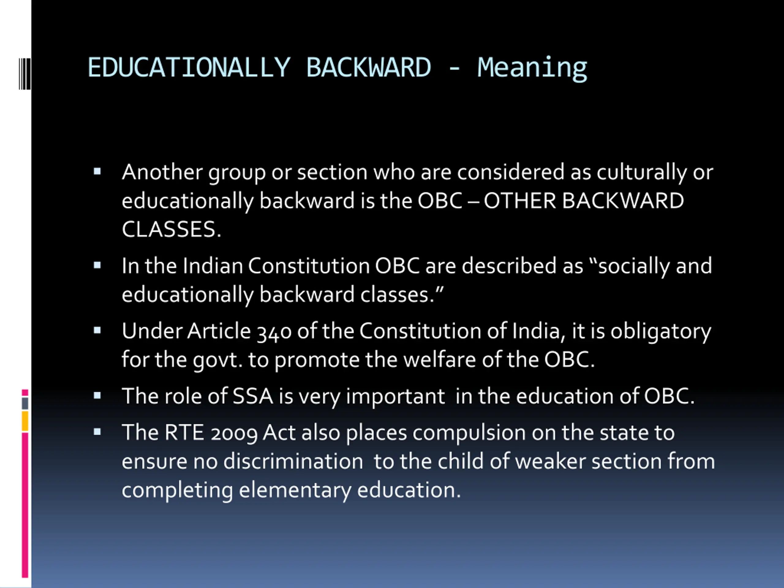 EDUCATIONALLY BACKWARD - Meaning Another group or section who are considered as culturally or educationally backward is the OBC OTHER BACKWARD CLASSES. In the Indian Constitution OBC are described as socially and educationally backward classes. Under Article 340 of the Constitution of India, it is obligatory for the govt. to promote the welfare of the OBC. The role of SSA is very important in the education of OBC. The RTE 2009 Act also places compulsion on the state to ensure no discrimination to the child of weaker section from completing elementary education.