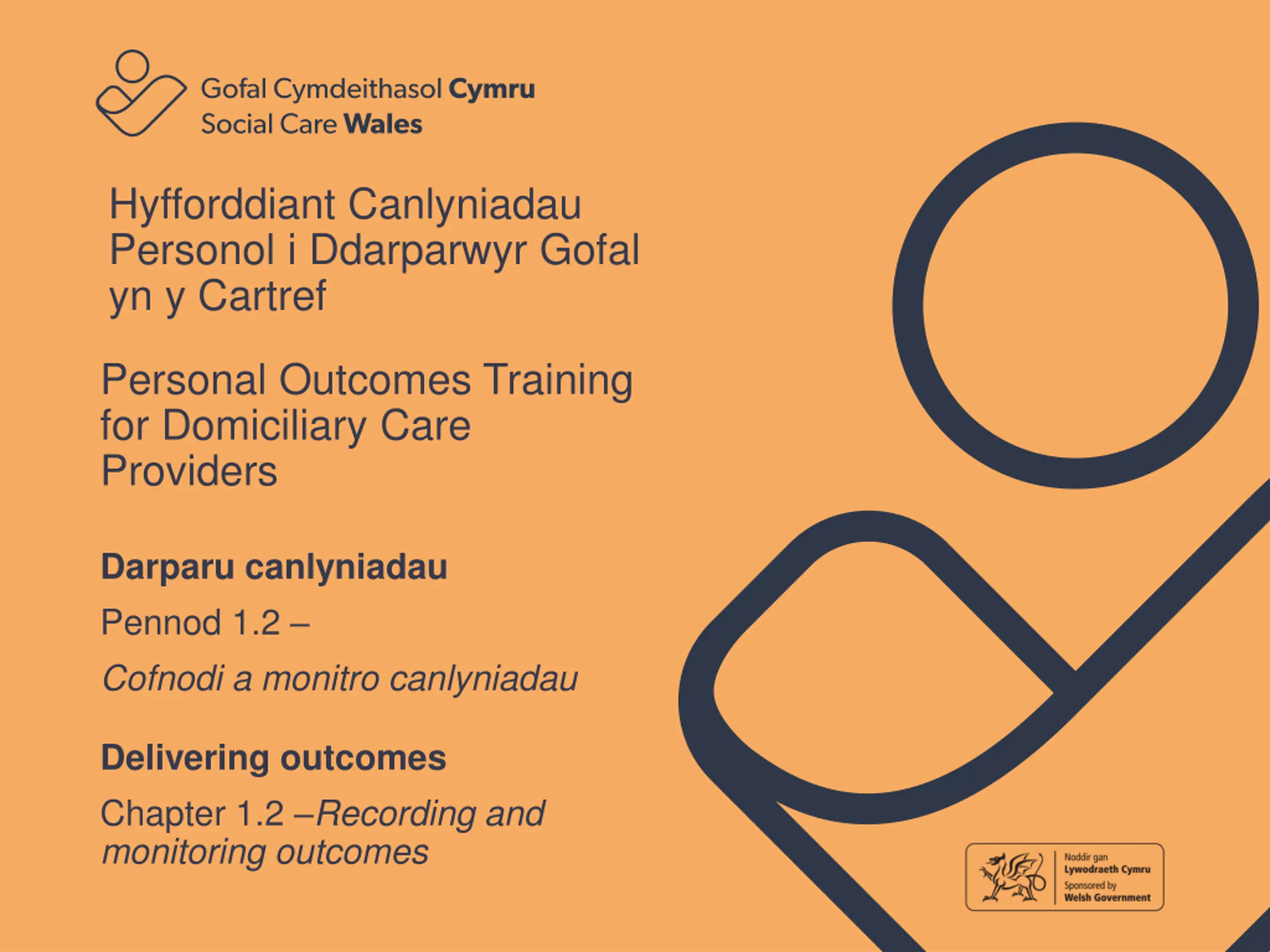 Hyfforddiant Canlyniadau Personol i Ddarparwyr Gofal yn y Cartref Personal Outcomes Training for Domiciliary Care Providers Darparu canlyniadau Pennod 1.2 Cofnodi a monitro canlyniadau Delivering outcomes Chapter 1.2 Recording and monitoring outcomes