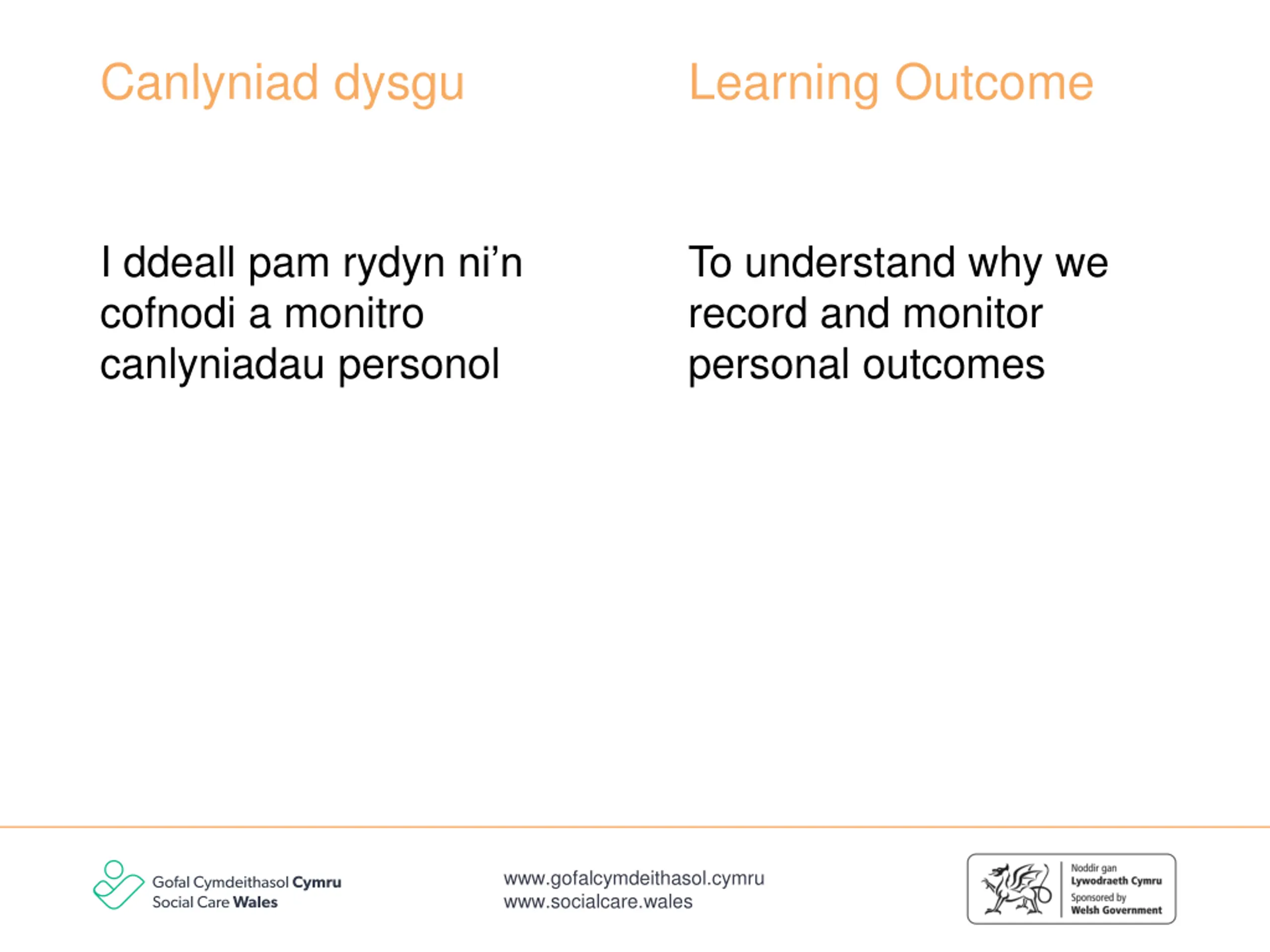 Canlyniad dysgu Learning Outcome I ddeall pam rydyn ni n cofnodi a monitro canlyniadau personol To understand why we record and monitor personal outcomes www.gofalcymdeithasol.cymru www.socialcare.wales