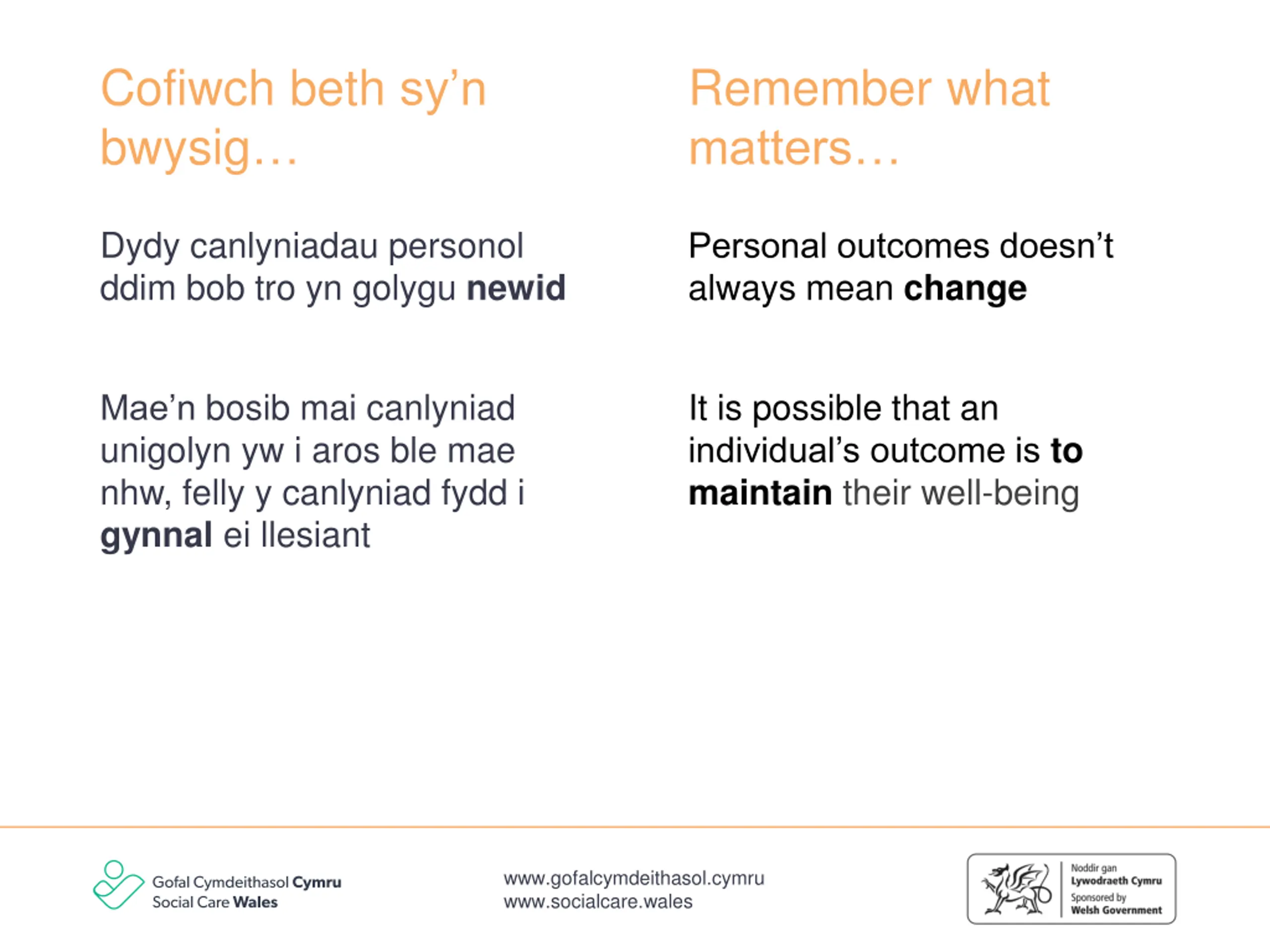 Cofiwch beth syn bwysig Remember what matters Dydy canlyniadau personol ddim bob tro yn golygu newid Personal outcomes doesn t always mean change Mae n bosib mai canlyniad unigolyn yw i aros ble mae nhw, felly y canlyniad fydd i gynnal ei llesiant It is possible that an individual s outcome is to maintain their well-being www.gofalcymdeithasol.cymru www.socialcare.wales